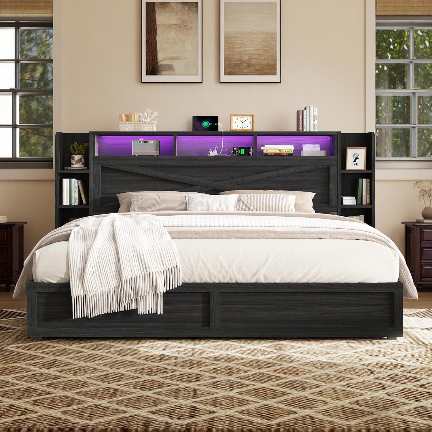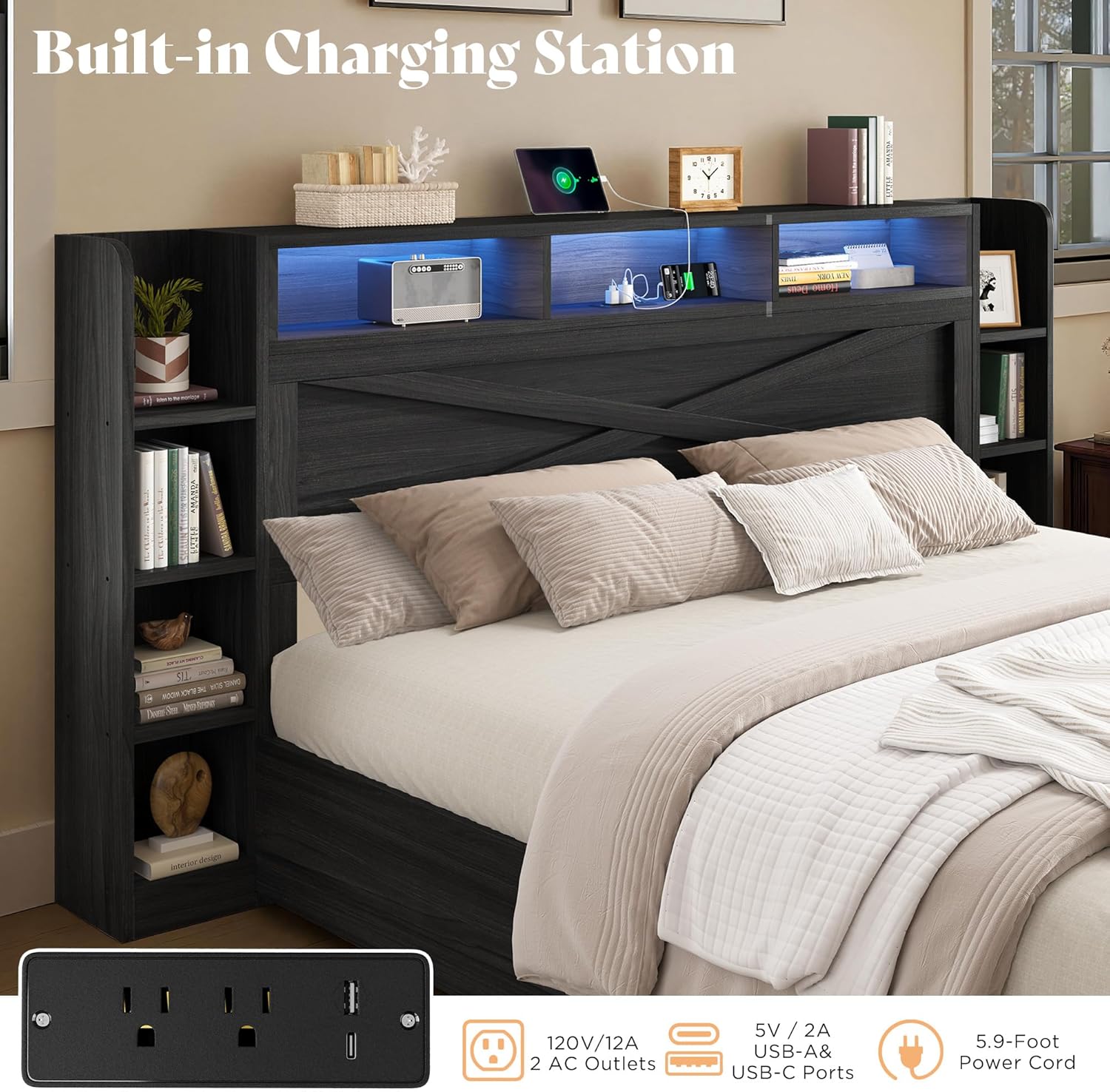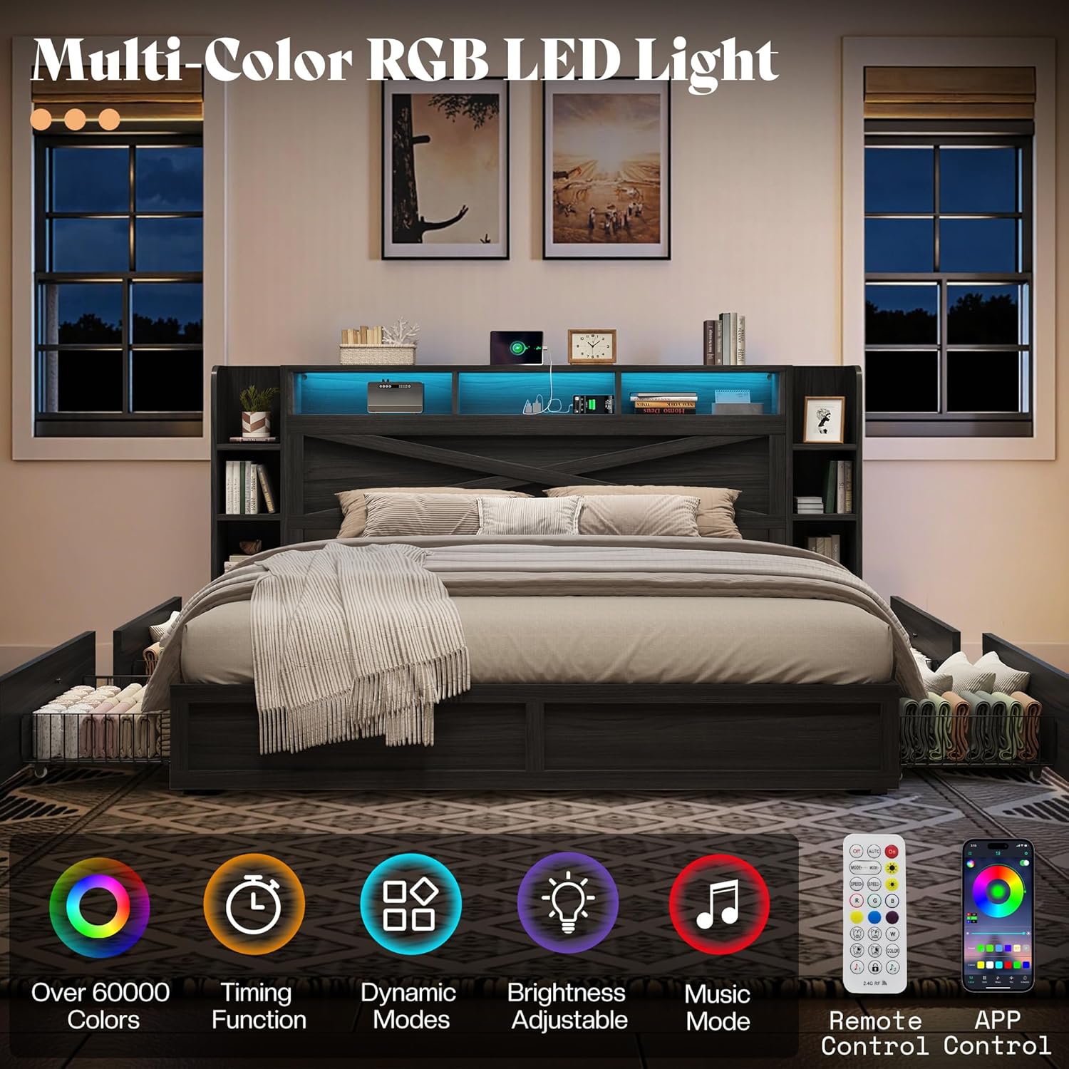 LED Light & USB Charging StationBuilt-in RGB LED light with 6000+ colors and adjustable brightness offers both mood lighting for bedroom. Control it via remote or mobile app. 2 AC outlets, 1 USB, and 1 USB-C port make this smart LED bed frame convenient for charging phones, tablets, or electronic devices.