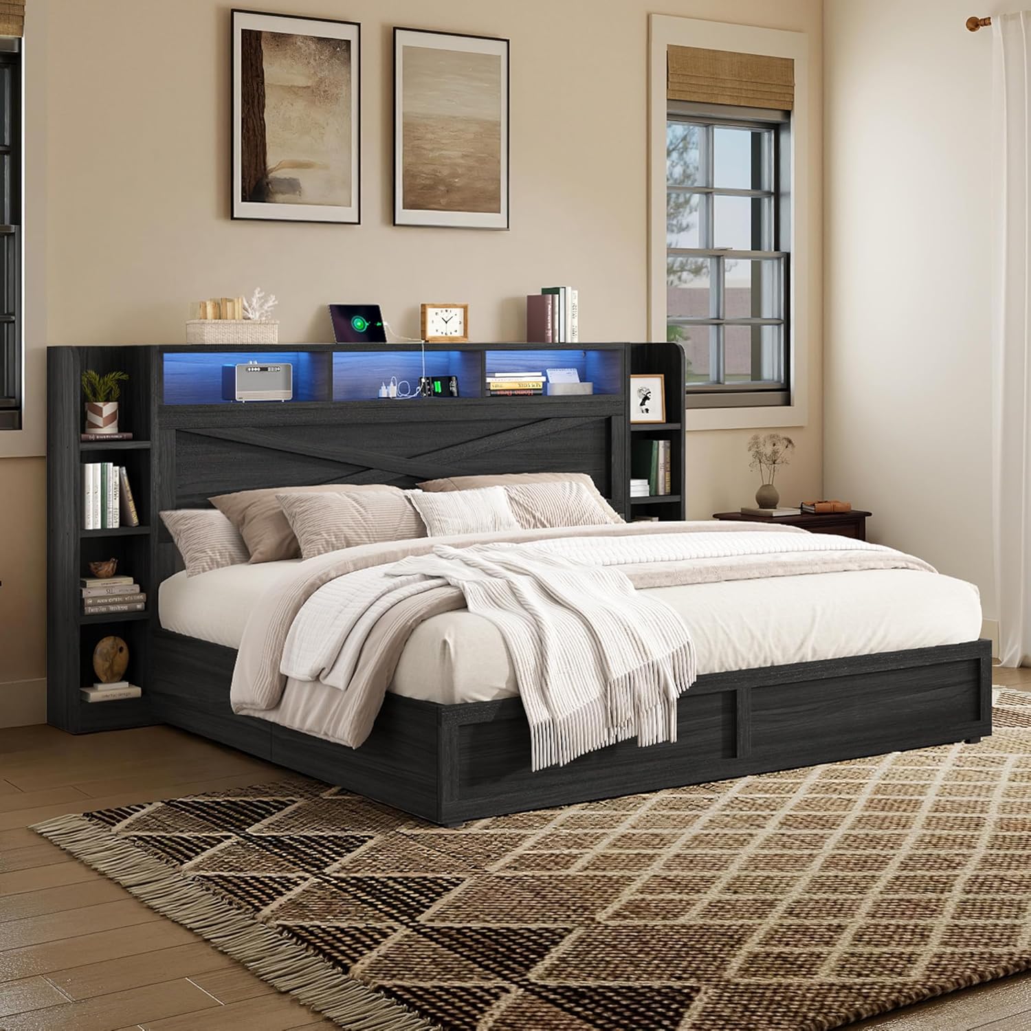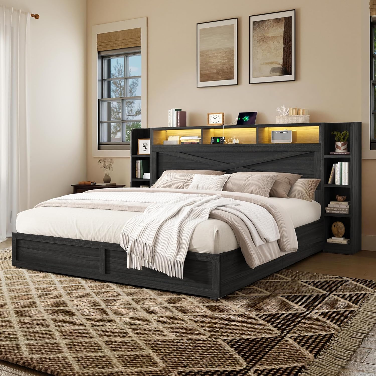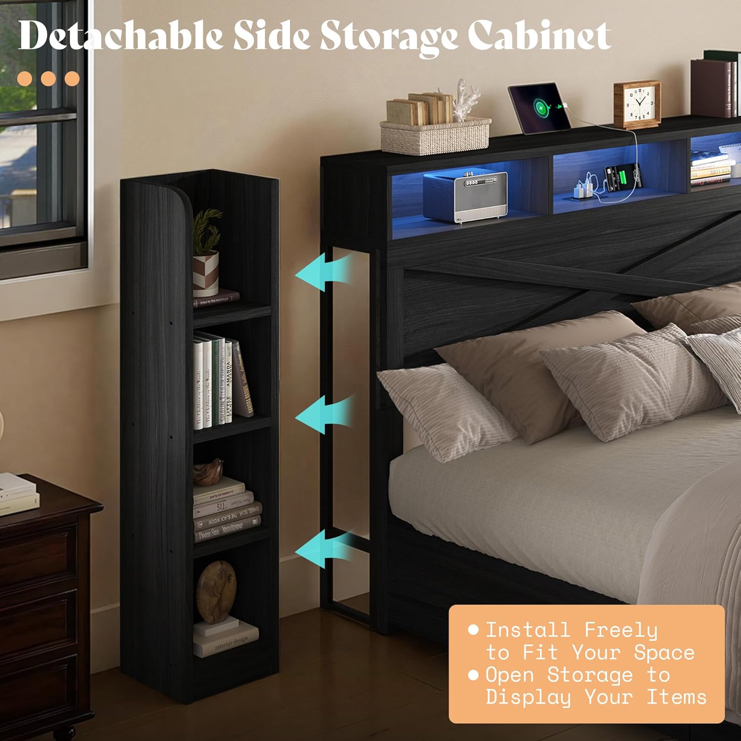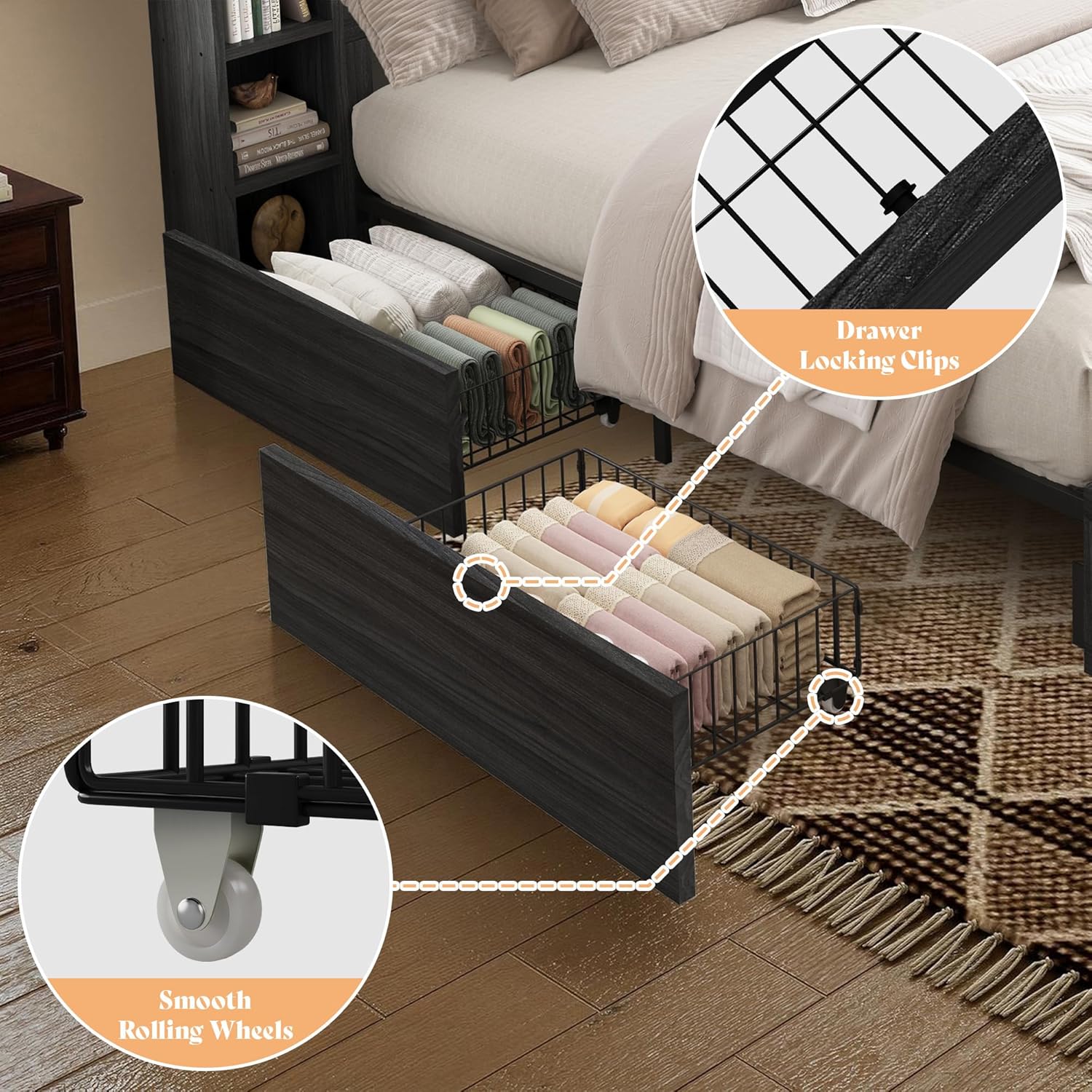 Detachable Side Cabinets & Safety Drawers: The detachable side storage cabinets can be positioned on either side of the bed for flexible room layouts. Each underbed storage basket slides smoothly on wheels and features secure lock clips that prevent slipping, keeping your storage safe, stable, and easy to access.