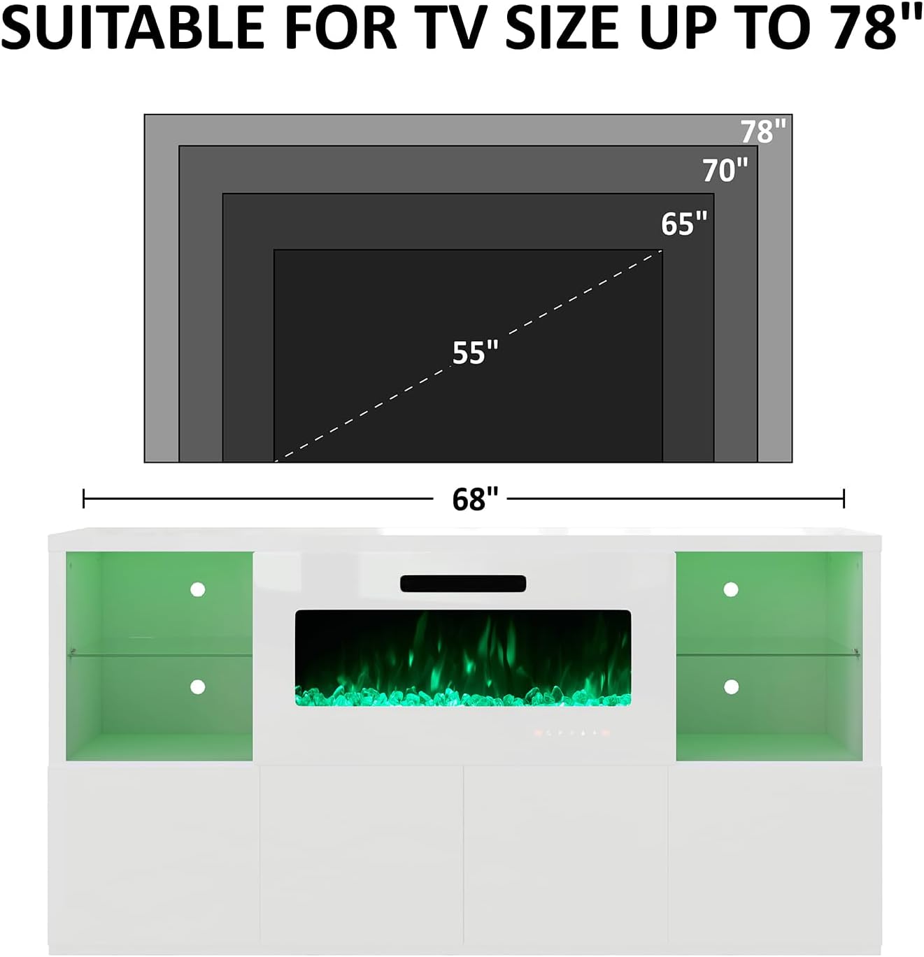 Fireplace Entertainment Center features 2 LED lighted open glass shelves that are perfect for displaying your favorite decorations. 4 lower storage cabinets with doors provide you with customized and ample room to store extras