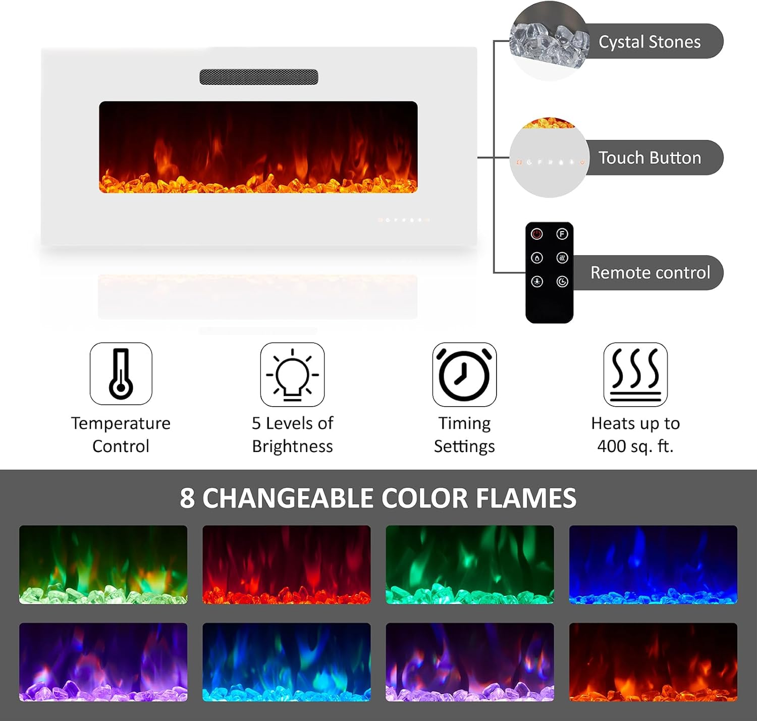 40" wide tv console fireplace clearance features touch button, 8 unique realistic flames (C1 is a cyclic gradient color) & 5 levels of brightness, temperature control, time setting. Remote control included.
