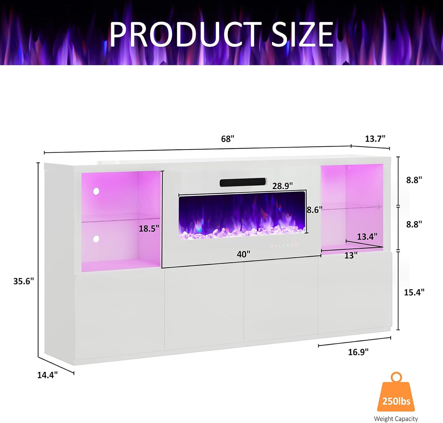 TV Console: 68" W x 36" H x 14.3" D. For flat curved screen TV up to 78 inches. Electric fireplace: 40" x 18.5". 750W/1500W power to achieve warmth and energy saving. Max weight capacity 250lbs.
