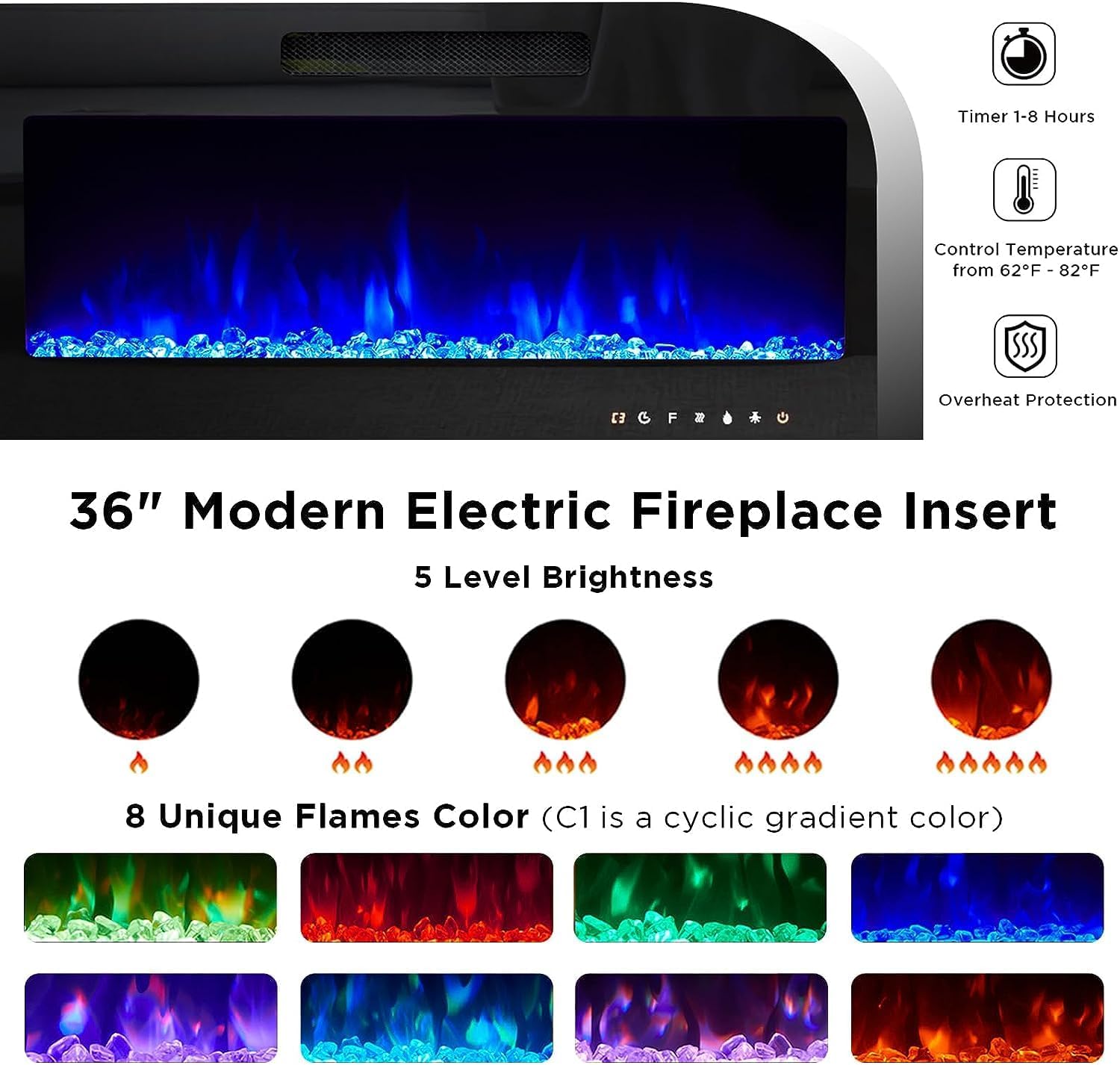 36 inch fireplace comes with realistic crystal stones and offers 3 flame colors & 5 brightness levels. It can quickly heat up to keep you warm, and also be used without heating as a nice piece of home decor