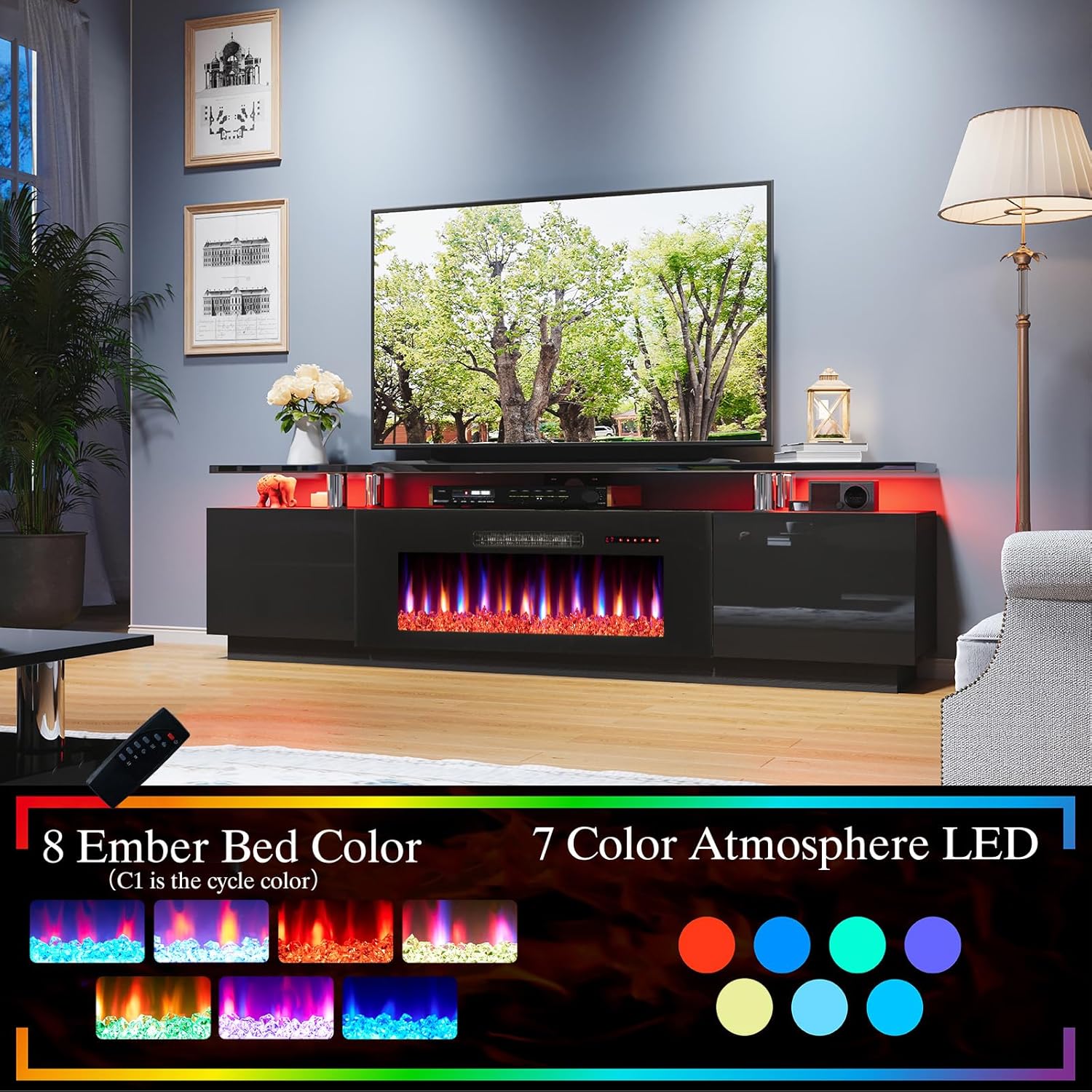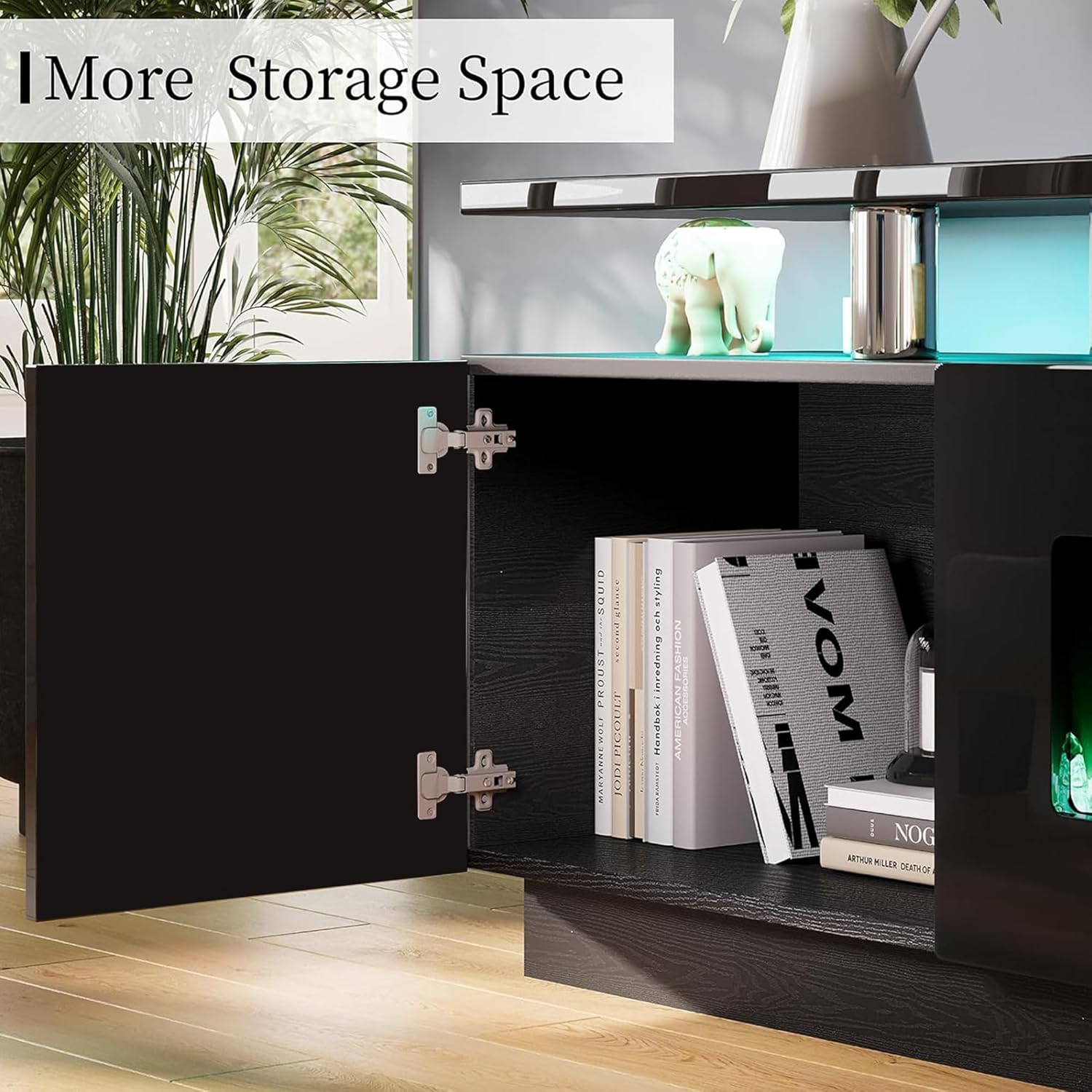 80" Wide high-gloss shelves and doors plus wood-grain body show luxury and modernity. LED kit includes 7 changeable colors and 56 kinds of color combinations to custom a personalized dazzle lighting atmosphere and unique experience