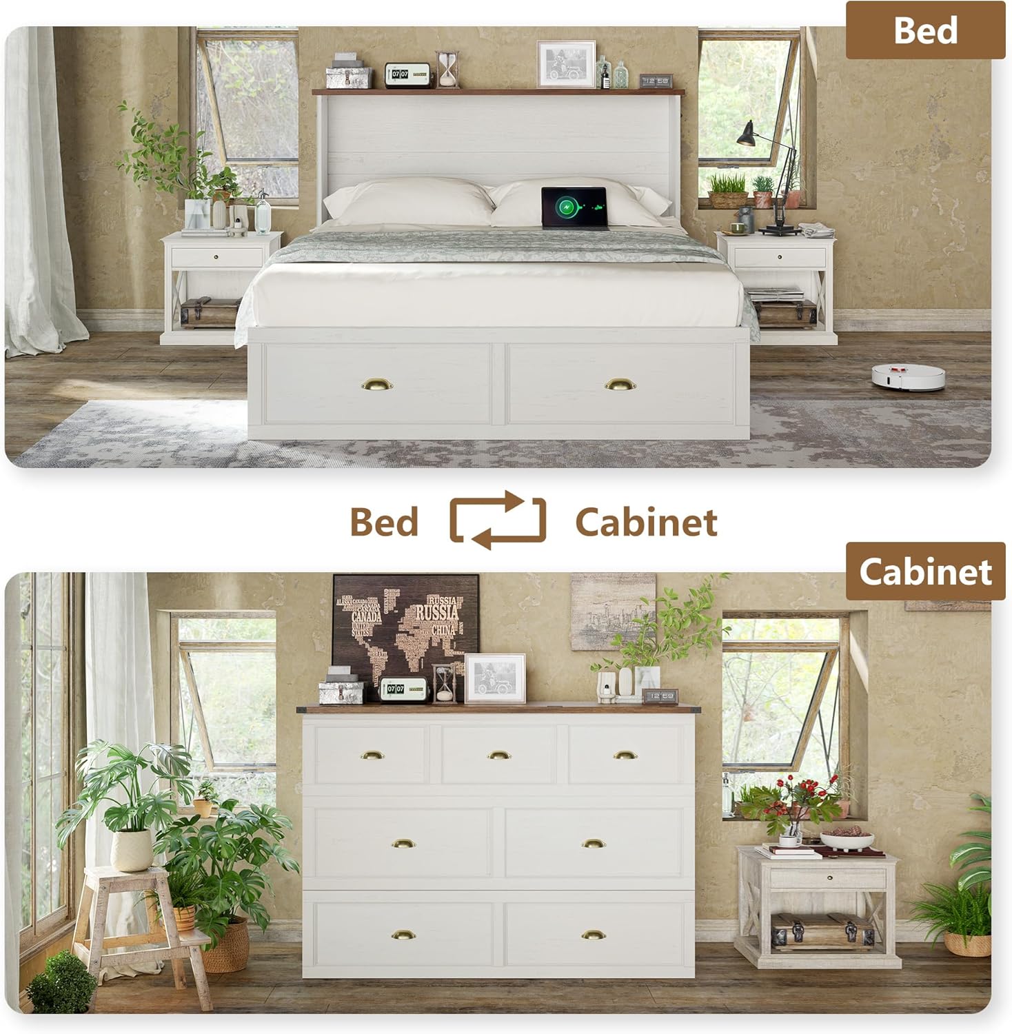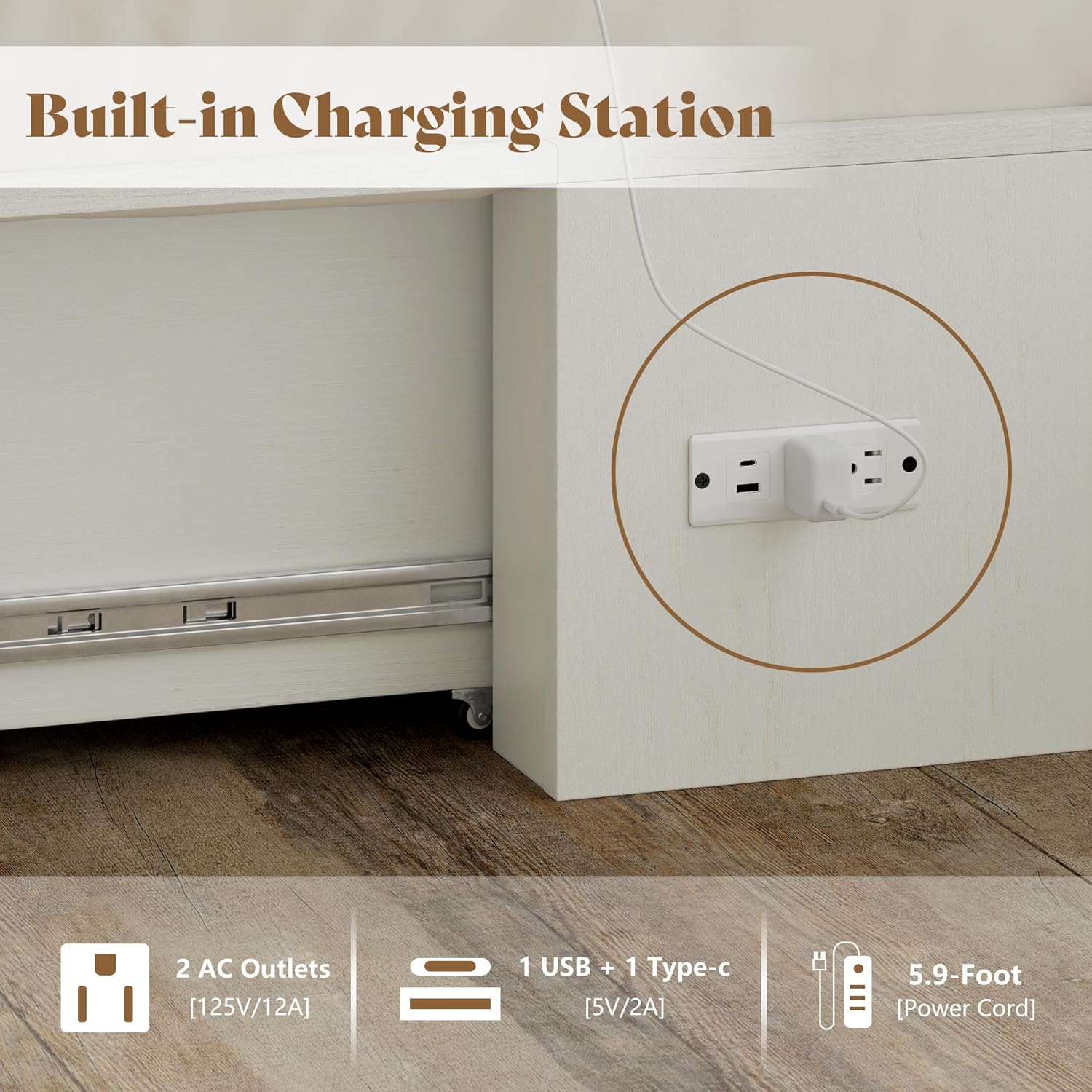 Built-In Charging StationWooden bed frame is equipped with 2 AC power outlets, 1 USB port, and 1 Type-C port, allowing you to conveniently charge your phone, laptop, or bedside lamp anytime