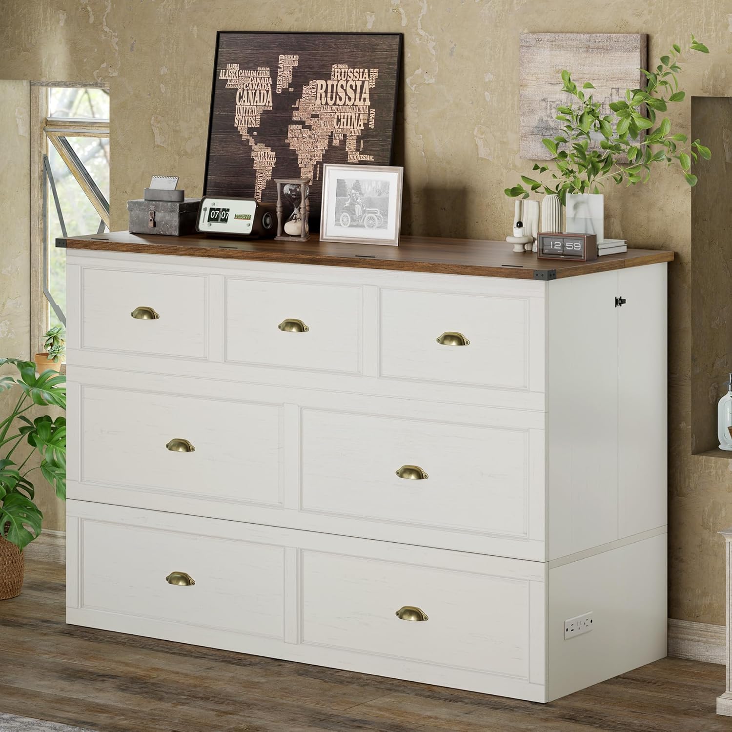 Spacious Storage SpaceWide tabletop holds your decor or daily essentials, while the large drawer underneath keeps bedding and off-season clothing neatly tucked away. A hidden compartment inside fits a tri-fold mattress (not included), maximizing space efficiency