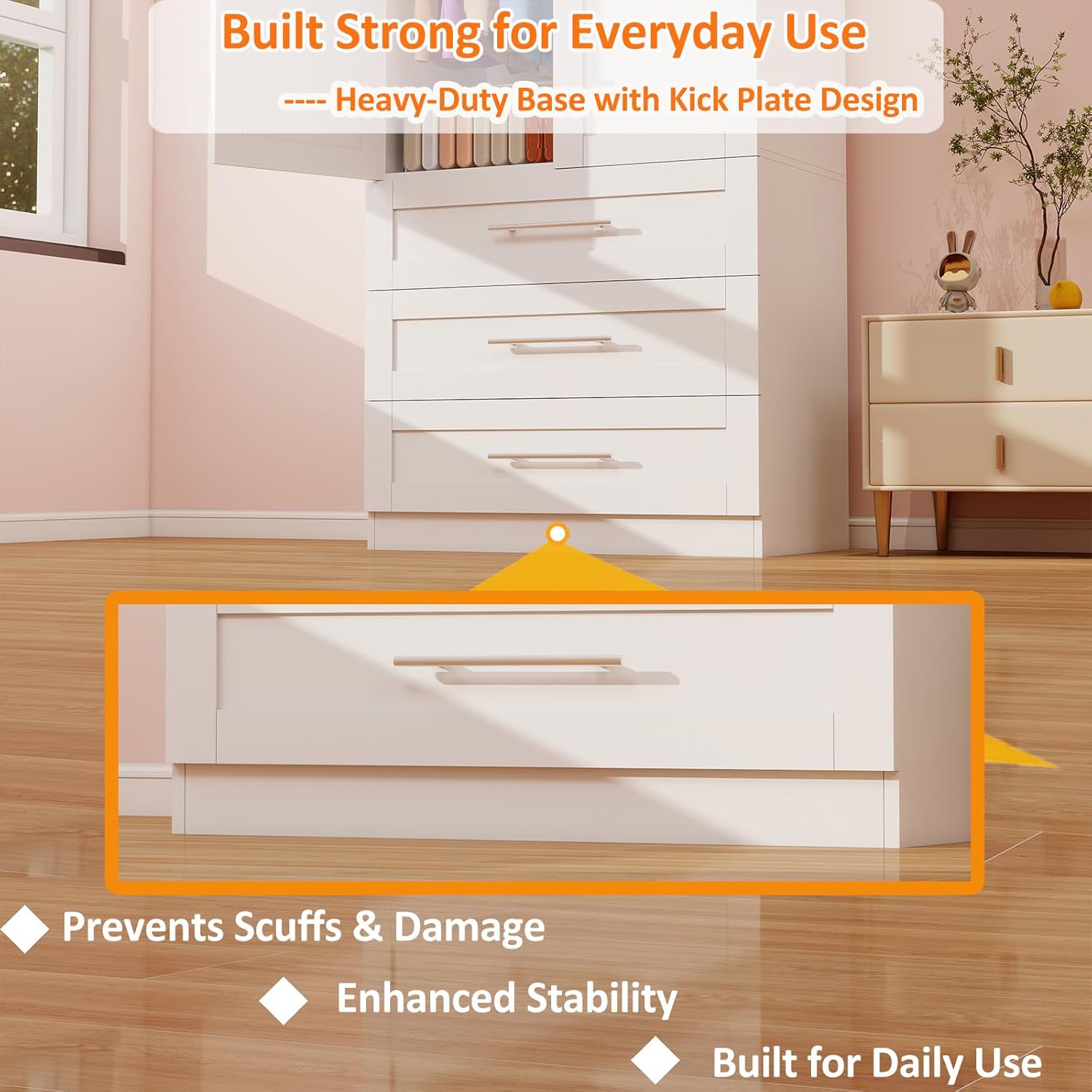 Heavy-Duty Base with Kick Plate DesignCrafted from high-quality engineered wood, this wardrobe features a reinforced heavy-duty base with an integrated kick plate that helps prevent scuffs and damage while enhancing overall stability for daily use. An anti-tip device adds extra safety, while cushioned hinges and smooth, silent metal drawer rails ensure quiet operation and long-lasting durability.