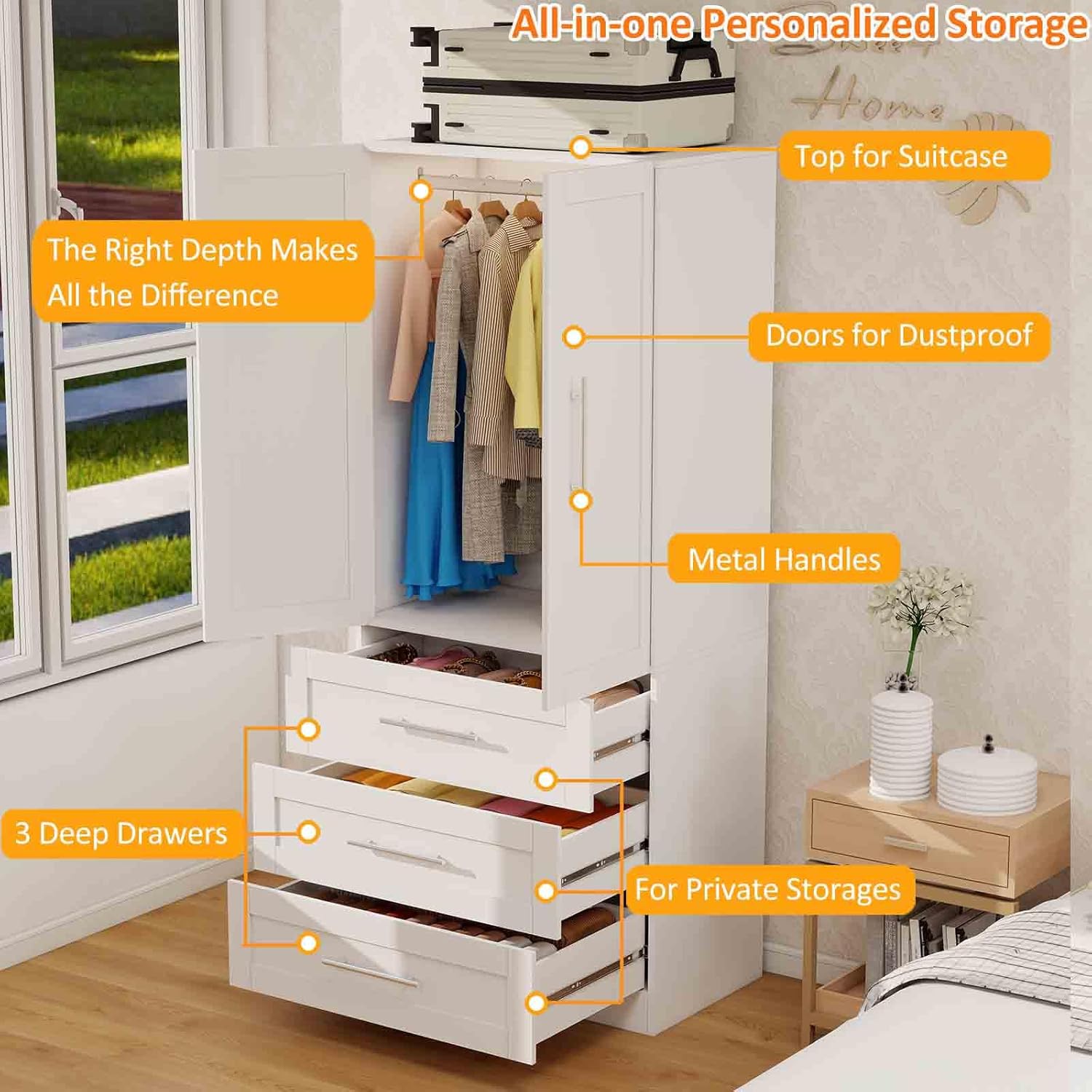 Stop Fighting Your Closet Doors 19" True Interior DepthToo shallow closets crush sleeves and jam hangers. Our wardrobe offers 19" interior depth with 1.9" extra clearance, letting clothes hang naturally and doors close smoothly every time. Compared to standard 18" closets, you get full hanger fit, no crushed clothing, and maximized storage space.