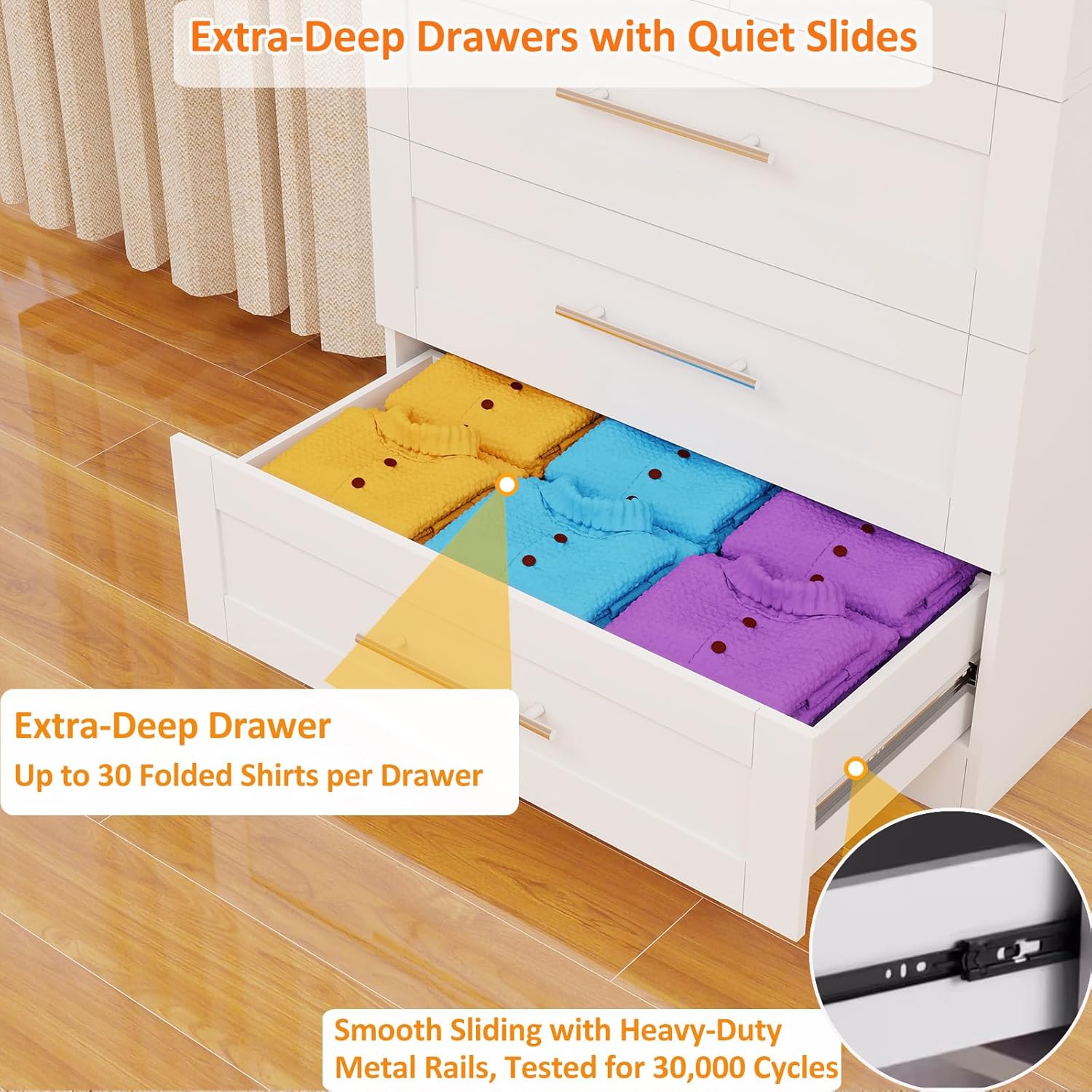 6 Wooden Extra-Deep Drawers This wardrobe features 6 wooden extra-deep drawers, each measuring 31.6" 15.7" 8.9", designed to hold 2535 folded shirts. The spacious design keeps your clothing neatly organized, makes it easy to separate items by type, and allows effortless access for hassle-free daily use. The deep drawers also provide a discreet space for storing underwear, lingerie, or other personal items securely and out of sight.