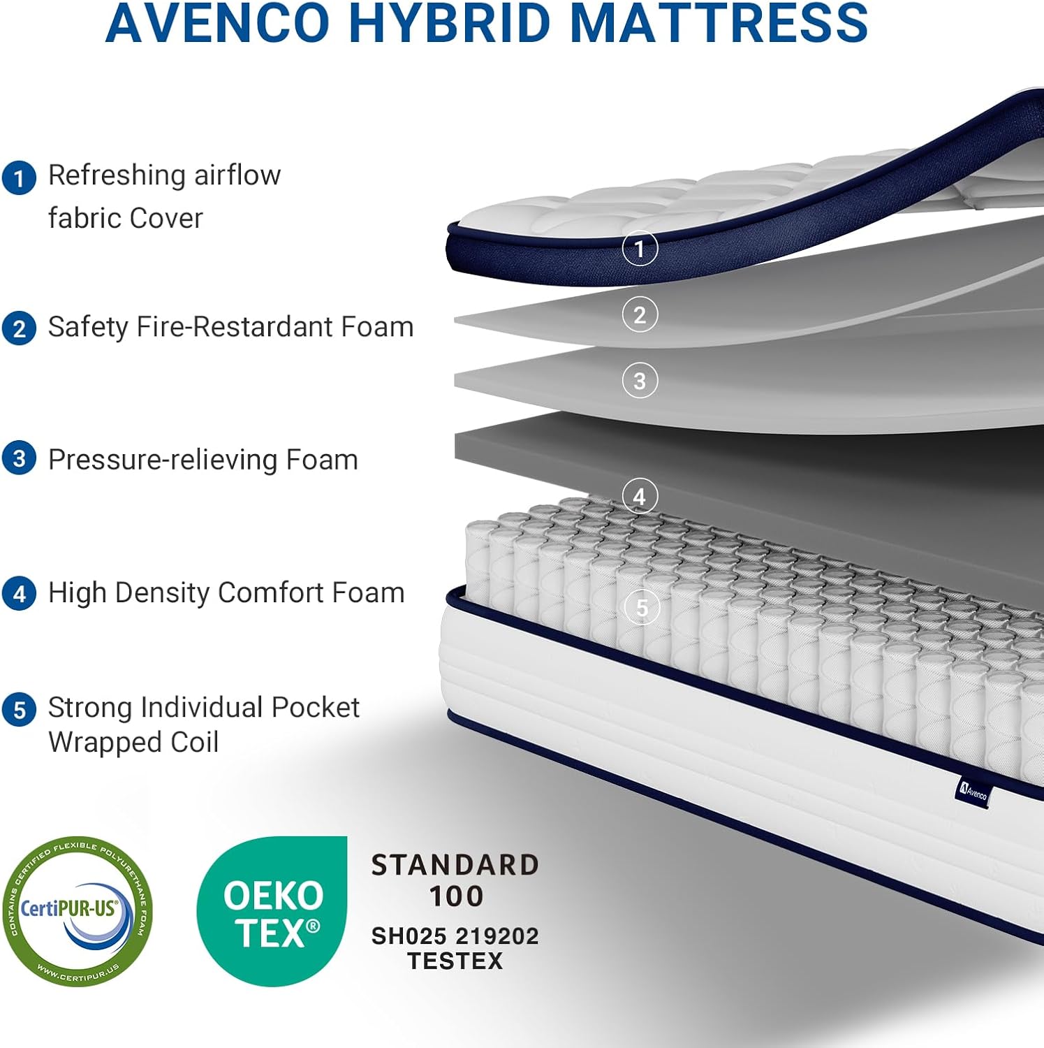 Hypoallergenic Certified Materials: Our king size mattress features a CertiPUR-US foam core and an OEKO-TEX certified cover, creating a clean, hypoallergenic sleep surface ideal for sensitive individuals