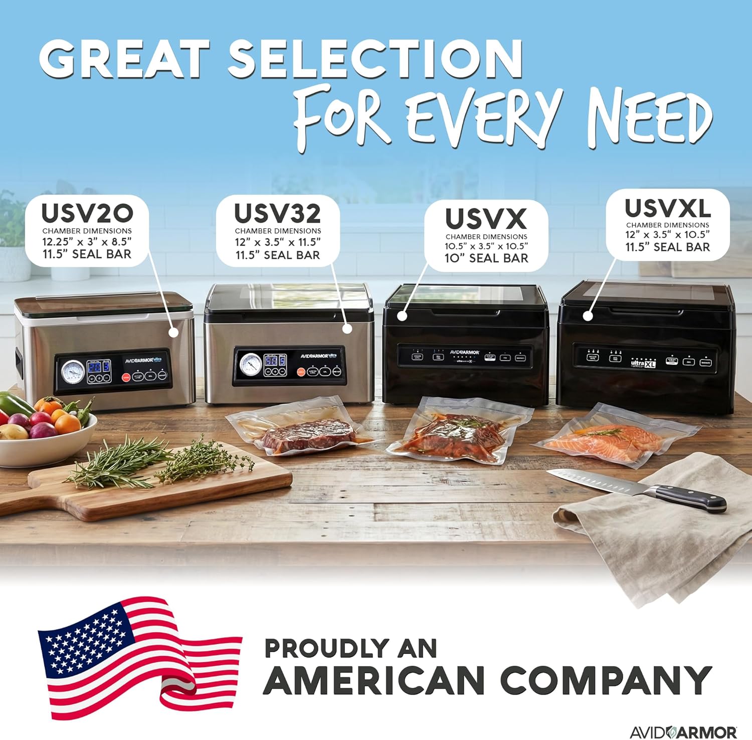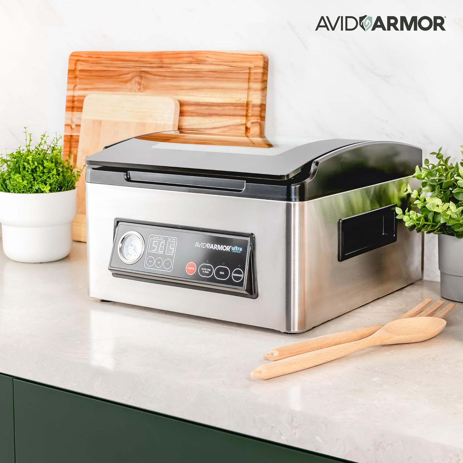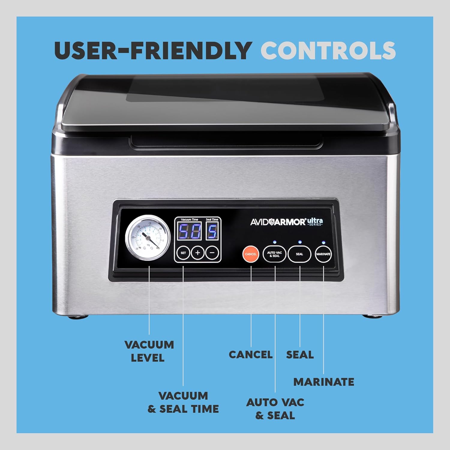Sleek, Compact Design - Pack individual or small, family-sized servings with our small vacuum sealer. This machine chamber measures 11.5W x 12D x 3.5H and has a clear glass lid for easy loading. The Ultra Series USV32 fits perfectly on most countertops.