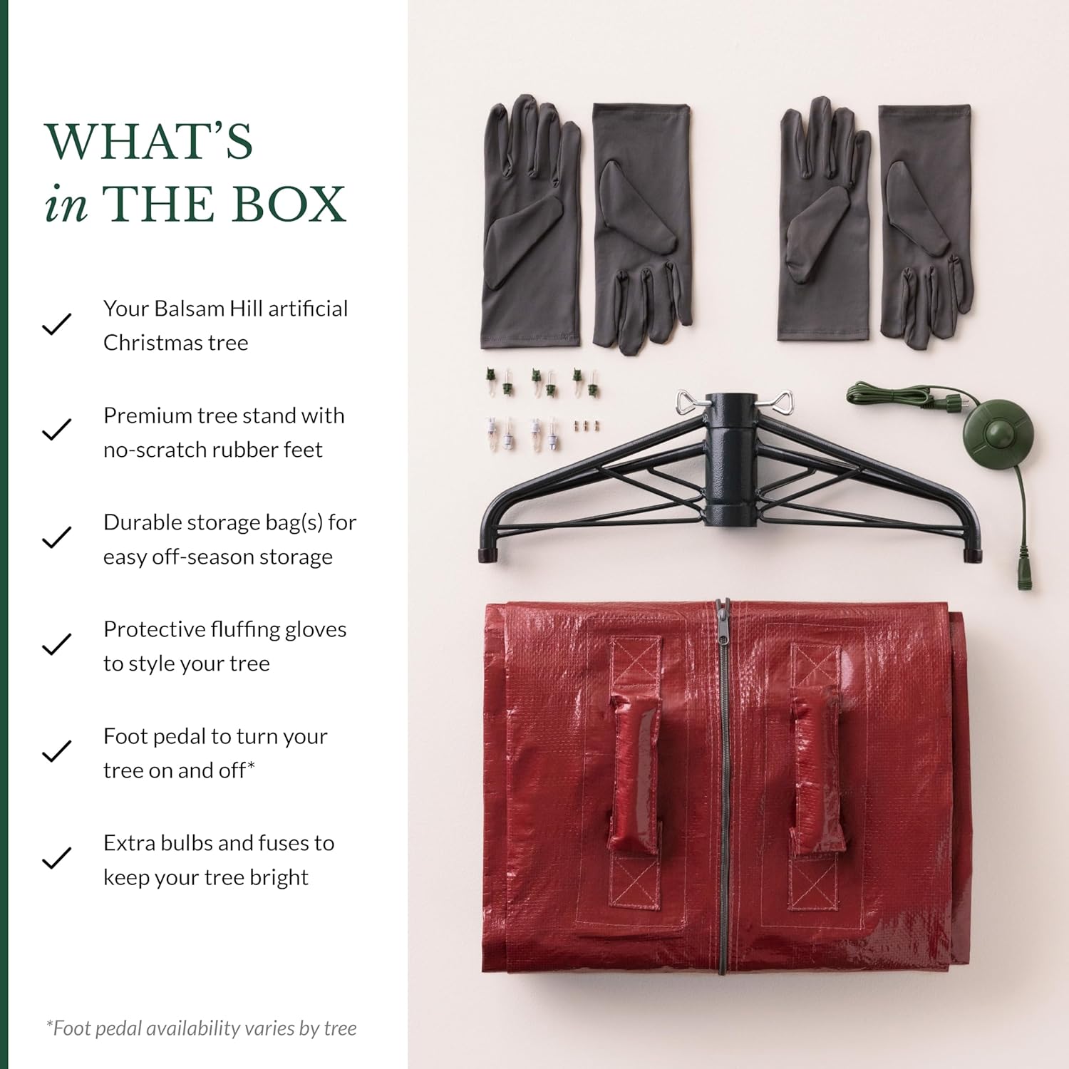 Complete Kit with Foot Pedal Control: This pre-lit artificial christmas tree includes premium christmas tree stand with scratch-proof feet, protective gloves, christmas tree storage box, convenient foot pedal for effortless tree lights control, plus extra bulbs and fuses - comprehensive artificial tree accessories deliver great value by eliminating separate christmas decor purchases