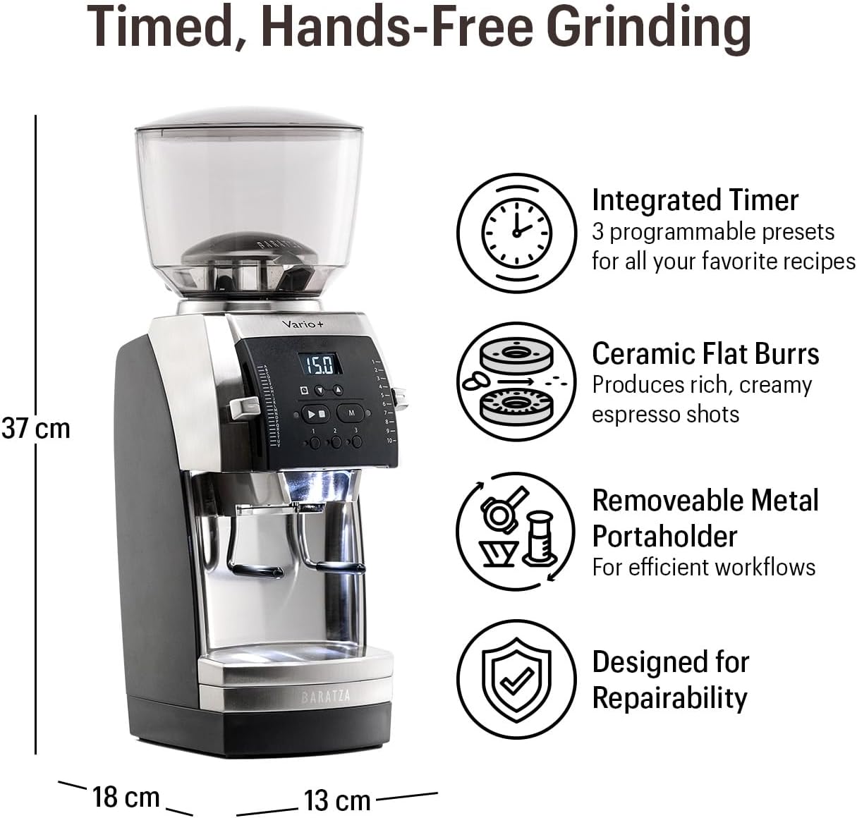 PORTAHOLDER & GROUNDS BIN: The Vario+ comes standard with a heavy-duty Metal PortaHolder and a regular 180g grounds bin.
