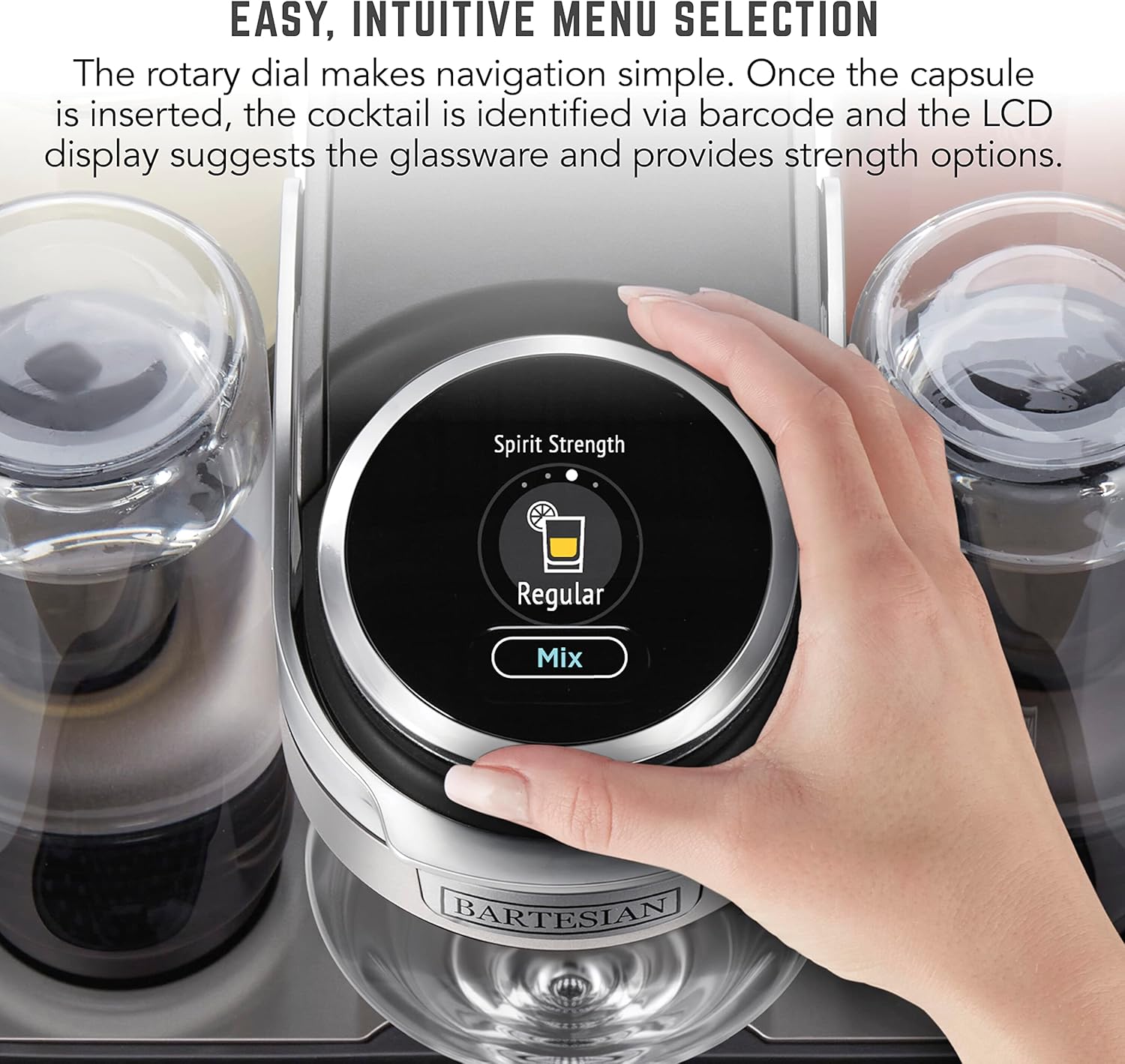 EASY, INTUITIVE MENU SELECTION. The intuitive rotary dial makes navigation simple. Once the capsule is inserted, the cocktail is identified via barcode and the user-friendly LCD display suggests the proper glassware and provides strength options.