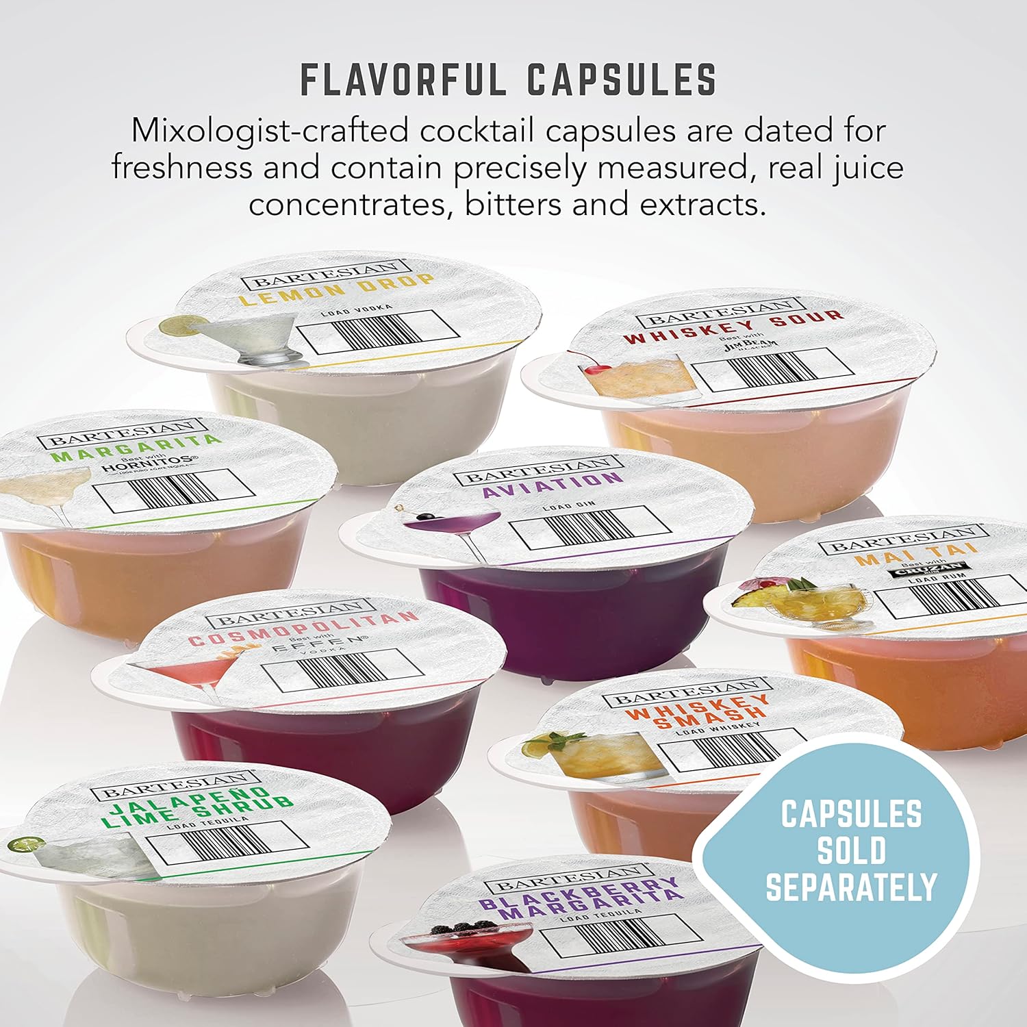 LESS TIME CLEANING, MORE TIME ENJOYING. The automatic rinse minimizes cleaning and prevents the previous cocktail's ingredients from mixing with the next one. Capsules pop up with spring assistance for quick removal and glass bottles are dishwasher safe.