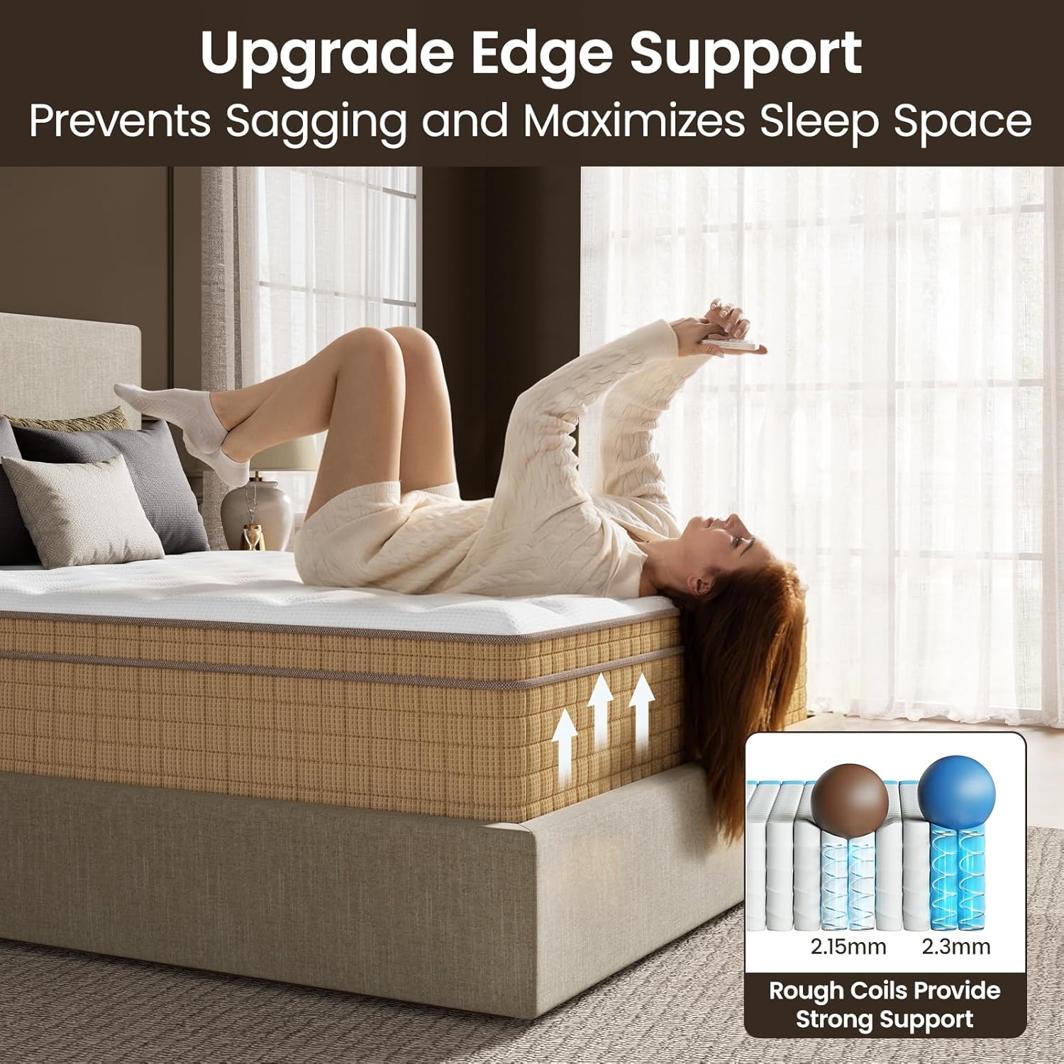 Cooling Gel Hybrid Design for Breathable SleepInfused with cooling gel memory foam, this breathable hybrid king size mattress helps regulate temperature throughout the night. The open coil structure enhances airflow between layers, allowing heat and moisture to dissipate efficientlycreating a cooler, fresher sleep surface for hot sleepers.