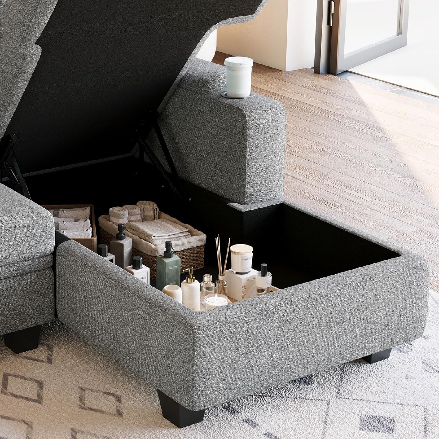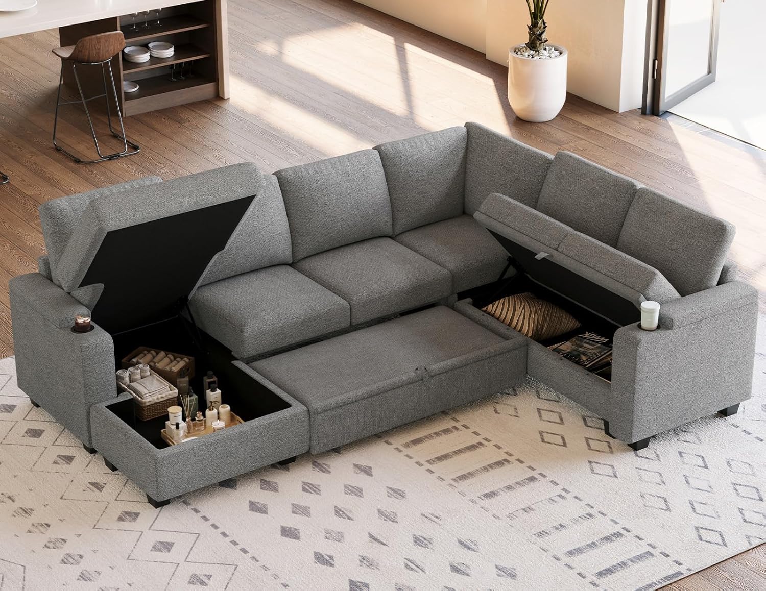 Storage Seats: Sectional couch with Storage. With storage compartments built into every seat and a chaise with storage, this versatile modular couch is the perfect blend of comfort and practicality.