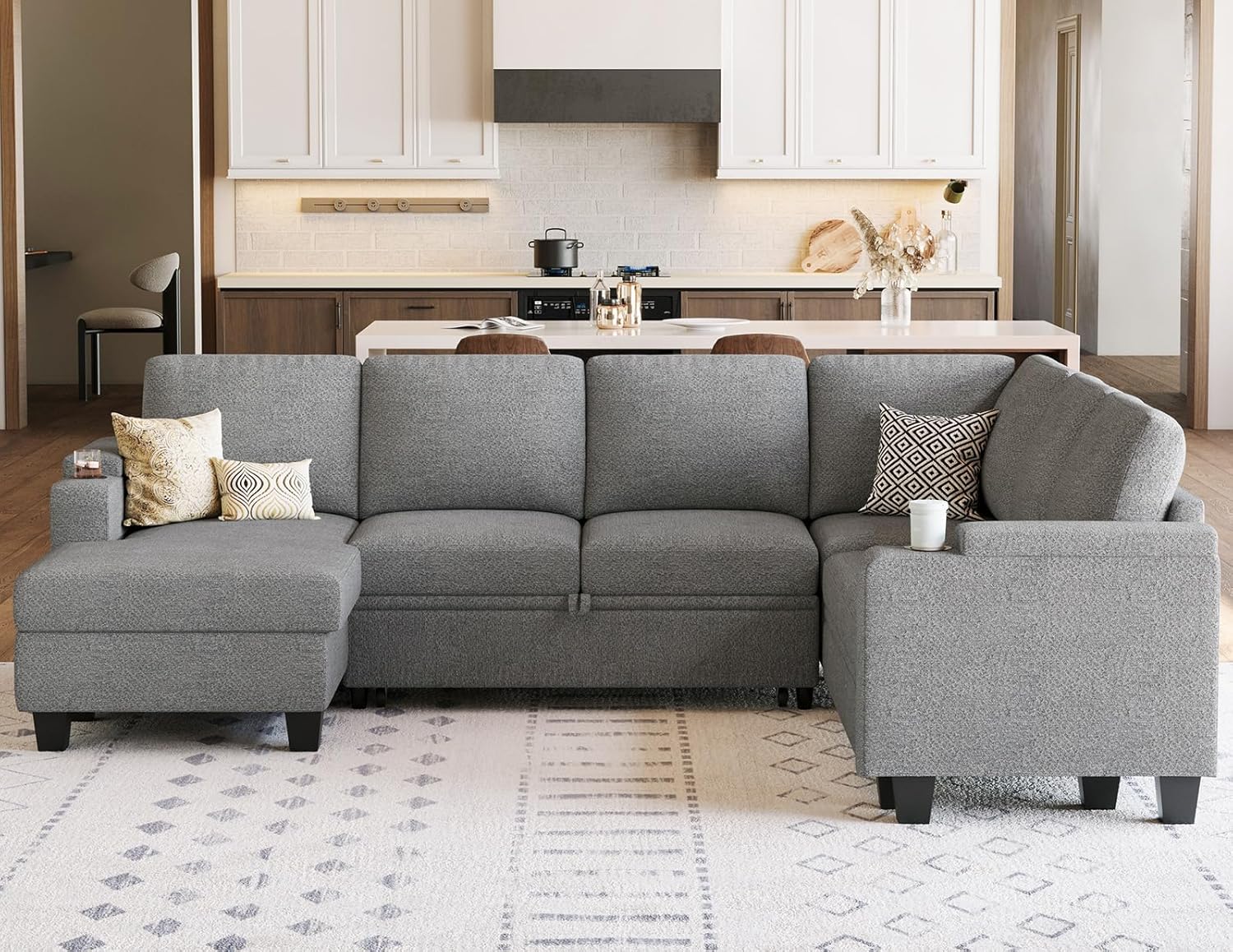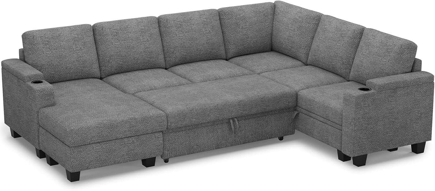 Pullout Bed with Cup Holder: Designed for relaxation and convenience, this pullout bed sectional includes a built-in armrest cup holder to securely hold your beverages, making it perfect for lounging and entertaining.