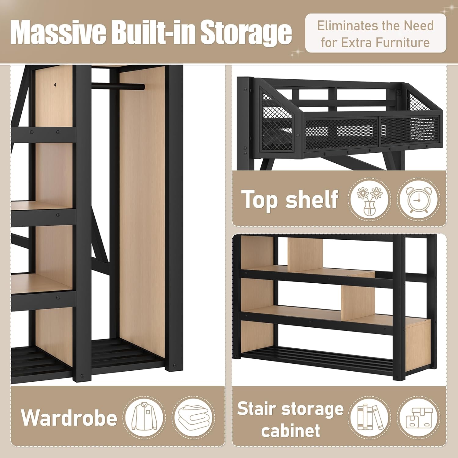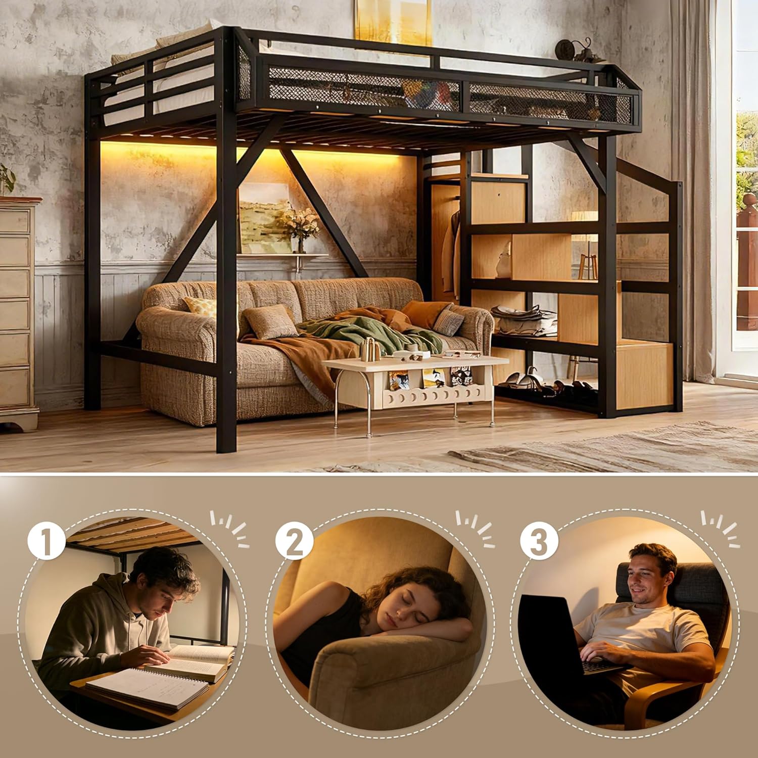 • Queen Loft Bed Frame with Storage Stairs, Beside Shelf & Wardrobe, Metal Queen Size Loft Bed with USB Ports&LED Light, Large Under-Bed Space Loft Beds for Adults,Teens, Kids, Black Natural
