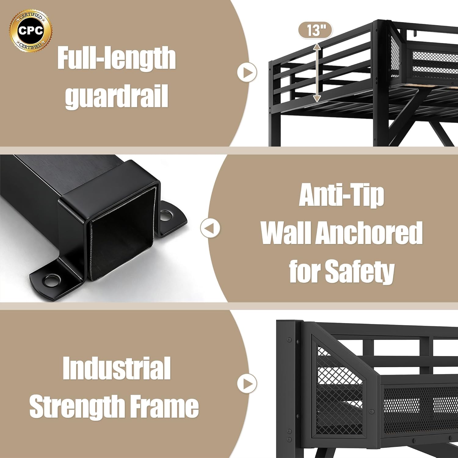 Heavy-Duty Queen Loft Bed Frame with Anti-Tip KitBuilt to last, this queen loft bed frame features sturdy metal construction, reinforced joints, full-length guardrails, and an anti-tip kit to secure the loft to the wall adding extra peace of mind for families using a queen size loft bed for adults or teens.