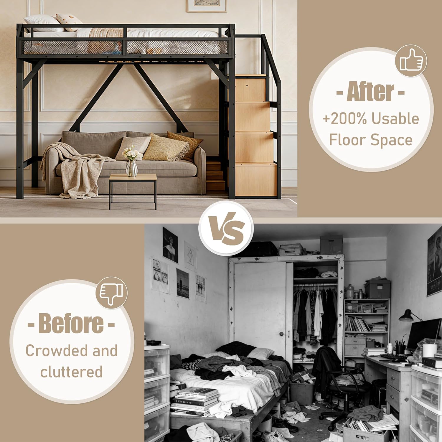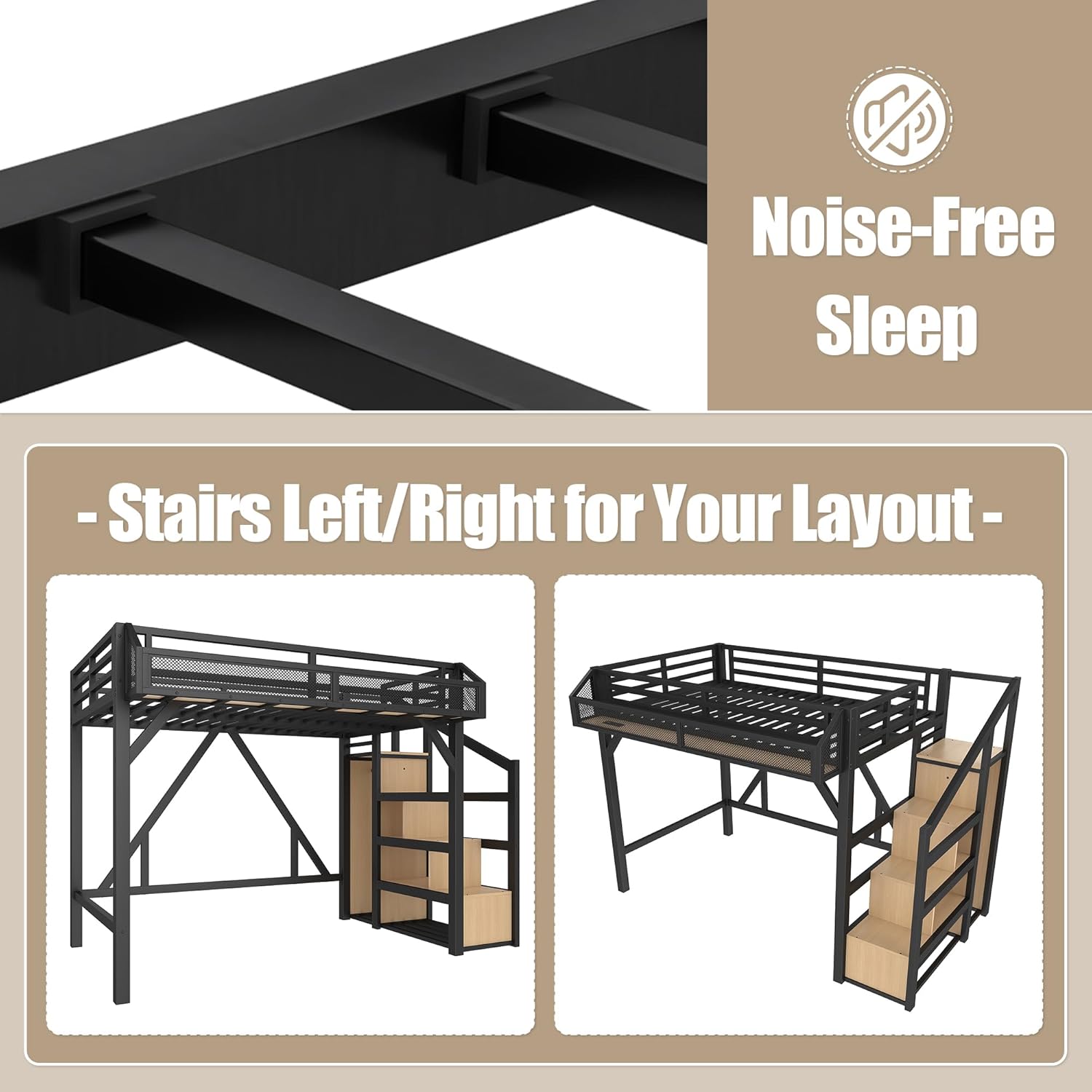 Noise-Free Sleep with Rubber StoppersThis metal loft bed uses upgraded rubber stoppers between the slats and the bed frame to reduce friction and squeaks. Enjoy quiet, restful nights plus generous under-bed space for a desk, small sofa, or extra storage makes this loft bed queen size adult perfect for tight urban living.