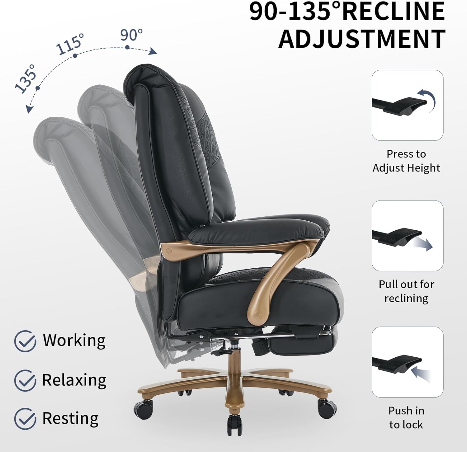 Multifunctional Chair: ergonomic office chair offers adjustable height (19-1/4" to 22-2/5") for different individuals. Big and tall office chair hold 400lbs, tilt back to 135, pull out the office chair retractable footrest, enjoy a good rest on the reclining office chair