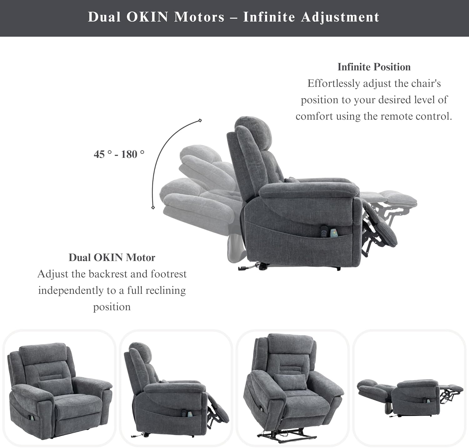 Dual OKIN Motor for Independent Control - Enjoy customized comfort with the quiet and reliable two OKIN motors of this lay flat lift recliner. The backrest and footrest can be adjusted independently, allowing you to find the perfect position for any activitywhether watching TV, reading, or taking a nap. The smooth lift-assist function offers added ease for those who may need extra support standing up particularly helpful for older adults and those recovering from surgery