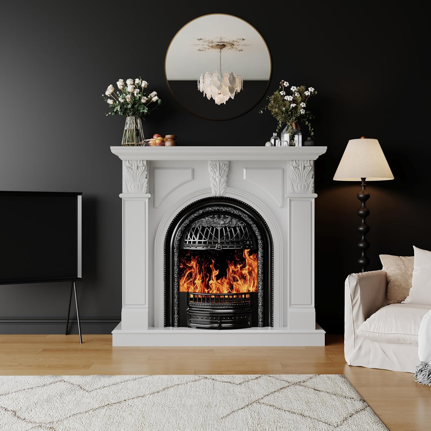 Elegant Craftsmanship with Premium Material - Made with high-quality engineered composite wood, this fireplace tv stand with white mantel features intricate classical carvings and square column design, adding European sophistication to your living space.