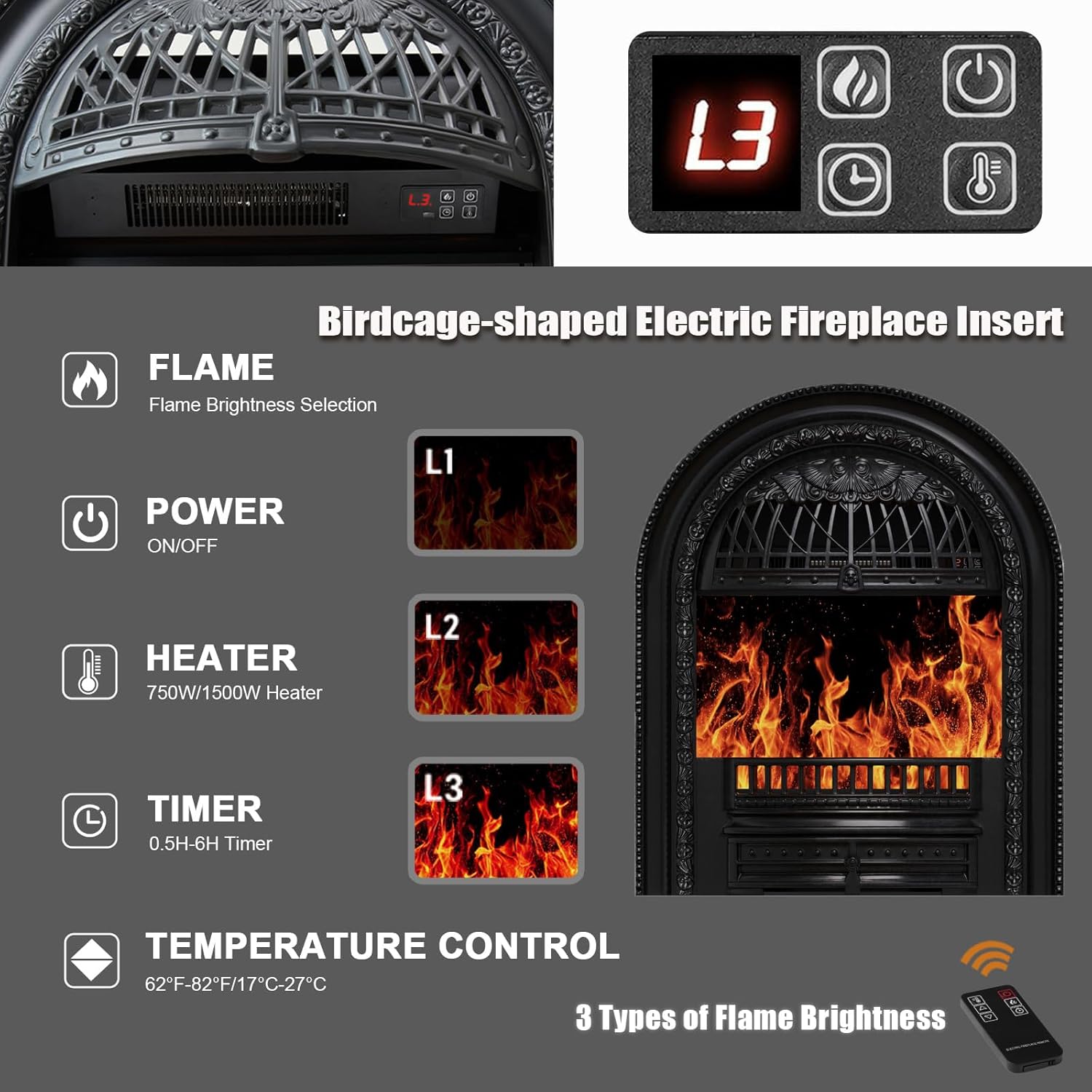 Unique Birdcage Firebox with 3 Flame Effects - The black birdcage insert of this eletric fireplace with mantel creates realistic flickering flames in 3 modes. Control all functions via remote: 22 temperature settings (62F-82F), 2 heat levels (1400W/750W), and 6-hour timer. Experience cozy ambiance without messy real fire.