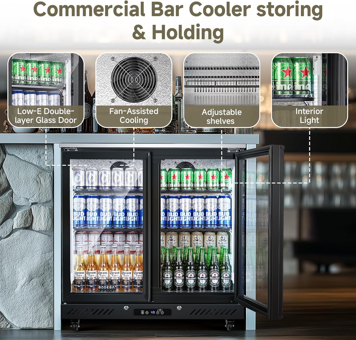 [Counter Height Bar Beverage Cooler] With a height of 36.8 inches and a depth of 21 inches, this bar refrigerator can easily slide under the bar counter to save space and increase space utilization. With 4 Adjustable shelves and extra Interior Light ,Dynamic Cooling double-door back beverage cooler is a great addition to any bar,restaurant,bakeries,cafes for holding canned or bottled soda,beer,water,wine,and more beverages.