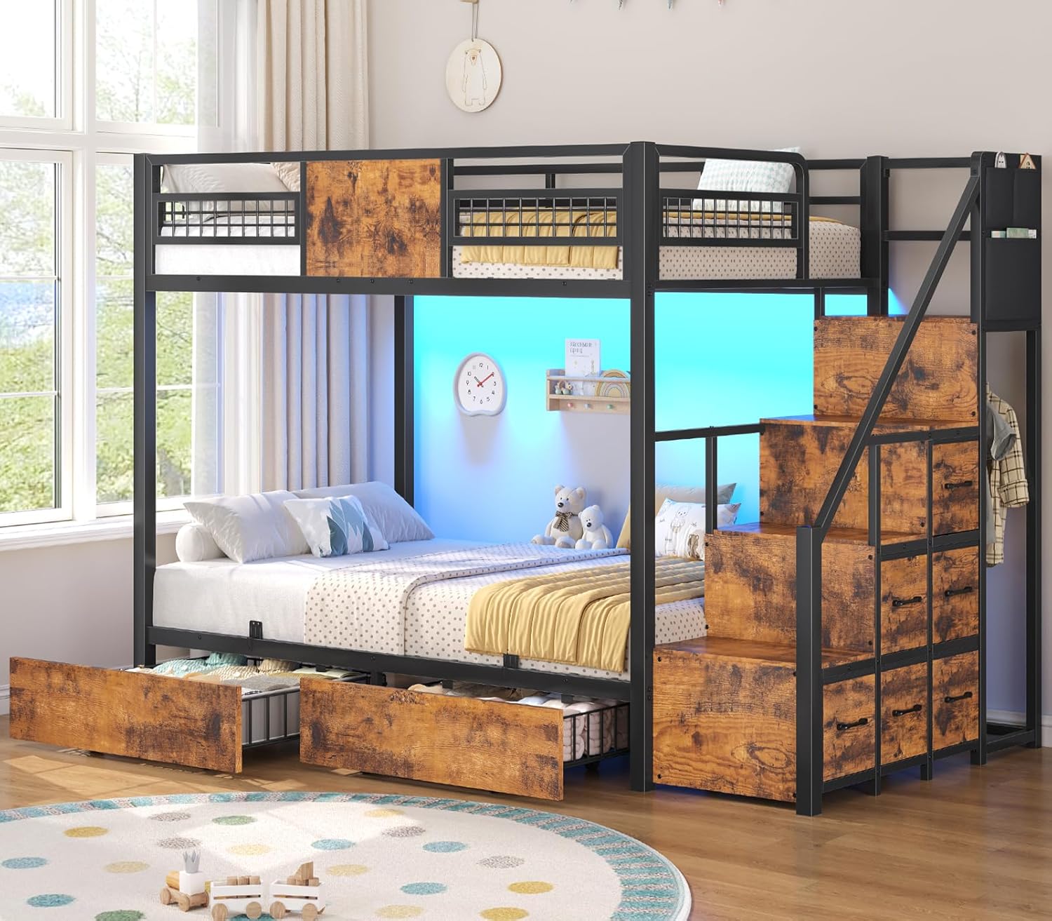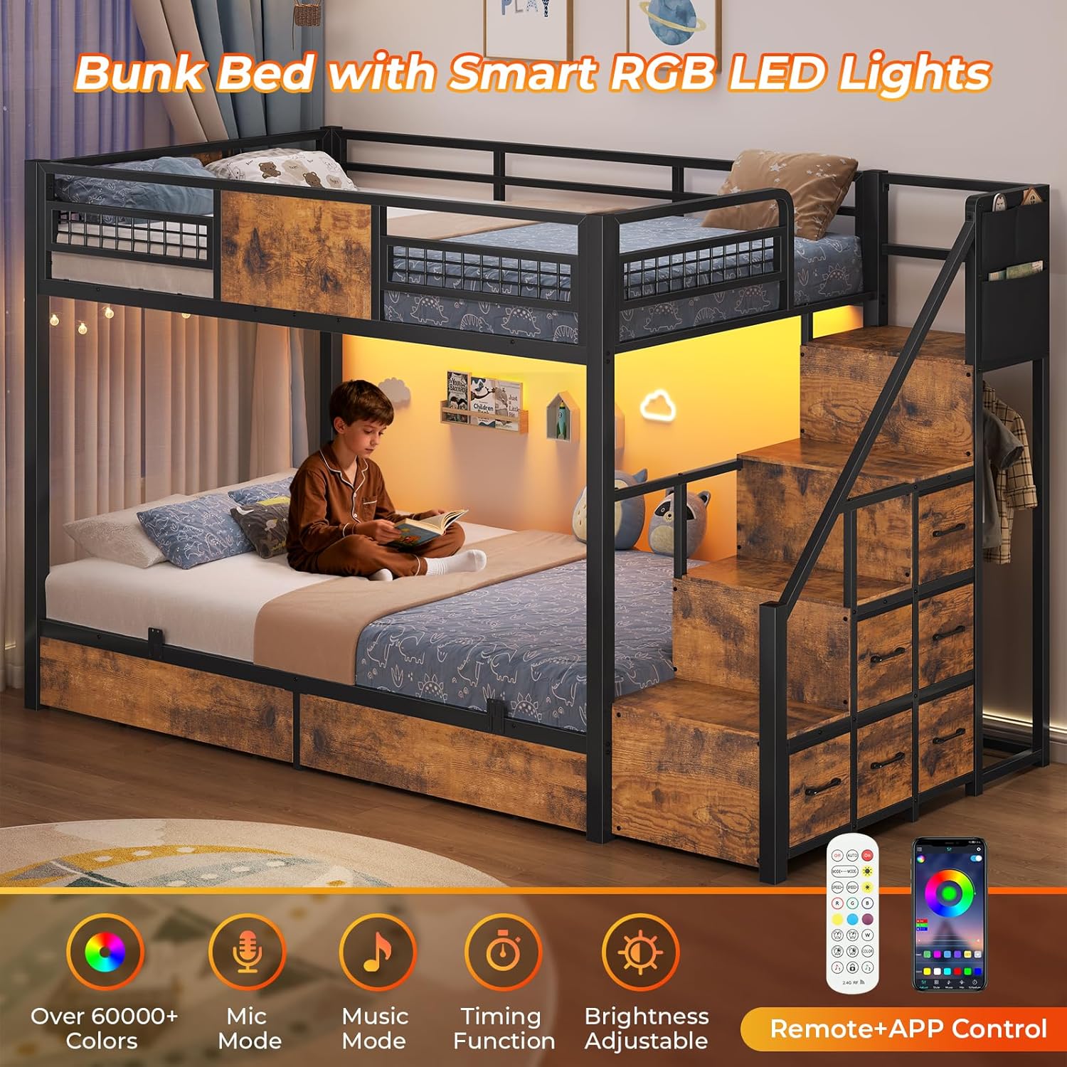 Cool LED Ambiance: Bunk Bed twin over twin equiped with advanced APP & Remote controlled samart LED lights, it offers over 60,000 colors for easily contorl brightness and different color, and is equipped with dynamic mode, music sync mode, mic mode, and timing modes for an immersive experience. Its the perfect fusion of innovative technology, playful design, and everyday functionality.