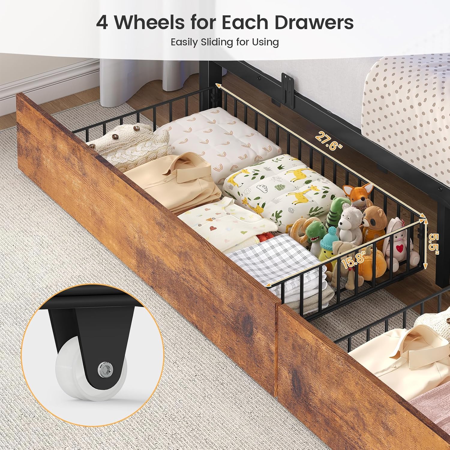 All-in-One Effortless Access Stairs: Unlike open-tread stairs, our bunk bed with stairs innovative design merges safety and accessibility with massive storage capacity. We've transformed the entire staircase into a functional storage unit, integrating six spacious fabric drawers directly into the structure. This clever solution not only provides a dedicated place for toys, books saving significant floor space