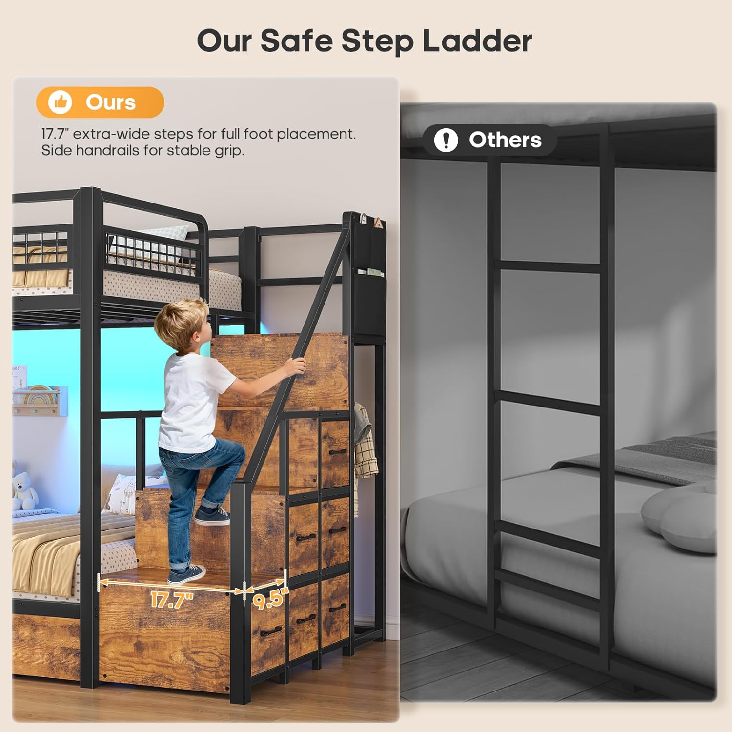 Safety Guardrails: Rest easy with the bunk bed designed for ultimate security. It features 13.4" high safety guardrails that create a secure sleeping zone. For complete stability, we include a heavy-duty anti-tip kit that permanently anchors the bed to your wall, proactively preventing tip-overs and ensuring a fortress-like safety for you. Especially unique staircase is wide, stable, and incredibly easy to climb, making nighttime trips up and down worry-free