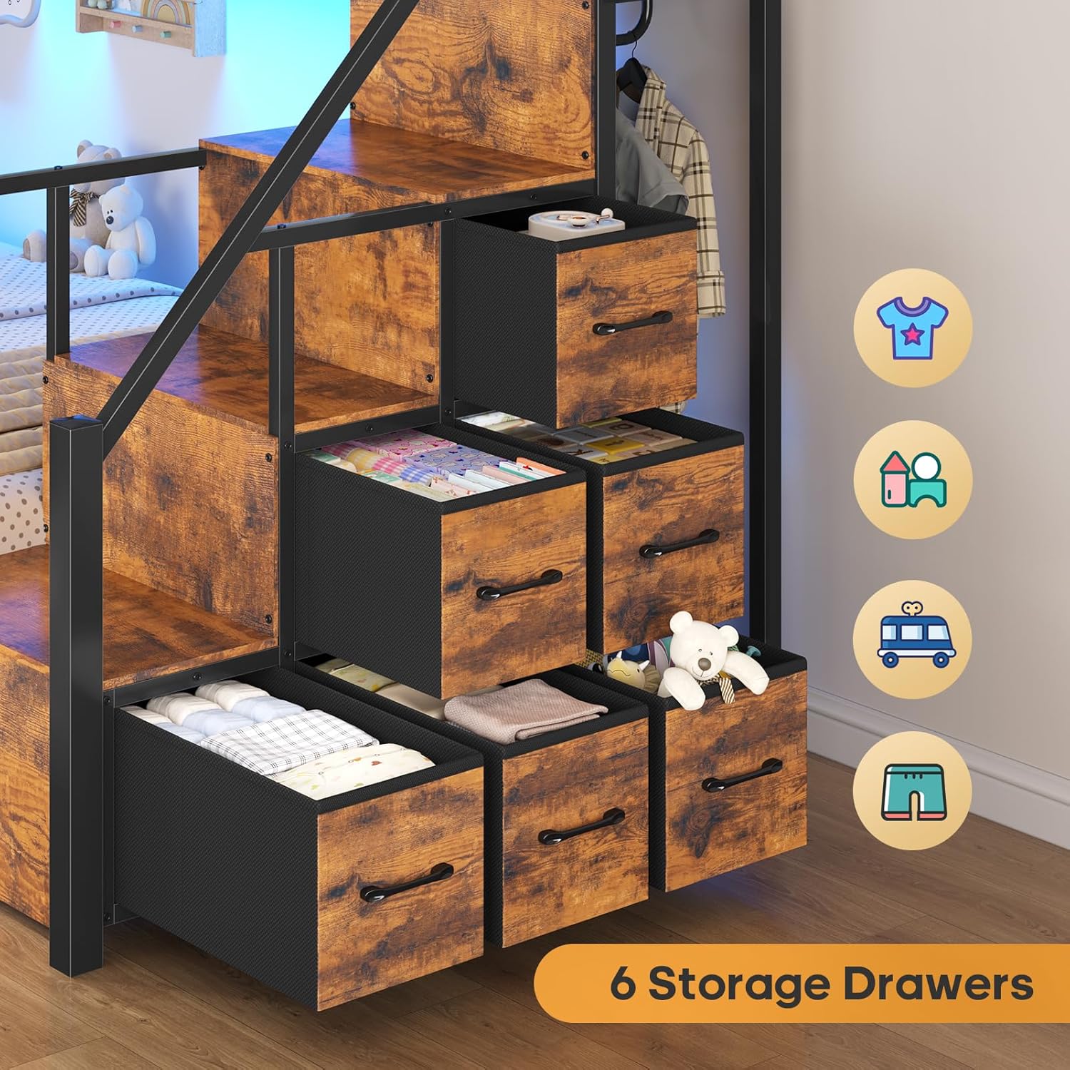 Multi-Functional Storage Twin Bunk Bed: Say goodbye to mess with our comprehensive storage solution. Beyond the 6 fabric staircase drawers, discover two extra-large pull-out drawers beneath the bed, constructed with durable wire mesh and wood panels and featuring smooth-rolling casters for easy access to heavy bedding or clothing. The included hanging fabric organizers provide perfect spots for daily items and outerwear