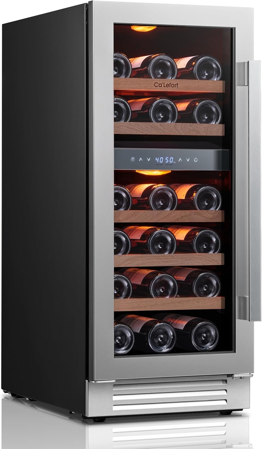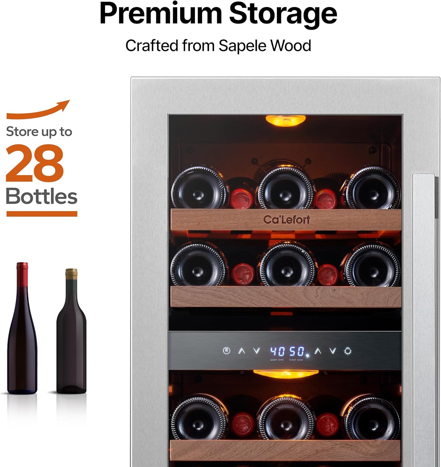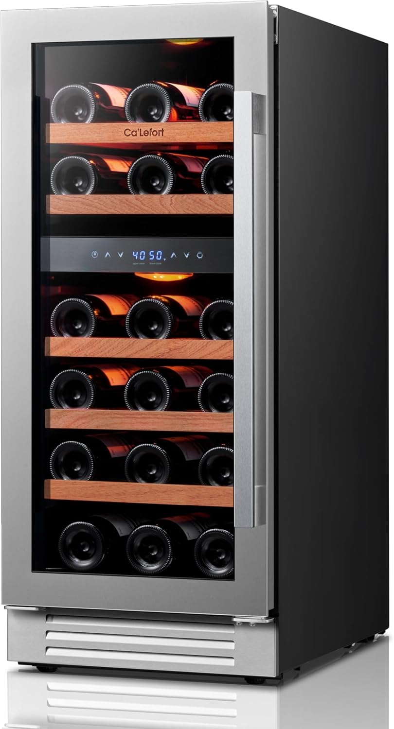 Large Capacity & Dual-ZoneWith 3.00 cu.ft of space and dual-zone temperature control, this wine cooler stores up to 28 Bordeaux bottles. The adjustable, sturdy Shabill wood shelves are corrosion-resistant and make accessing your wine collection easy, ensuring optimal storage conditions for each bottle.