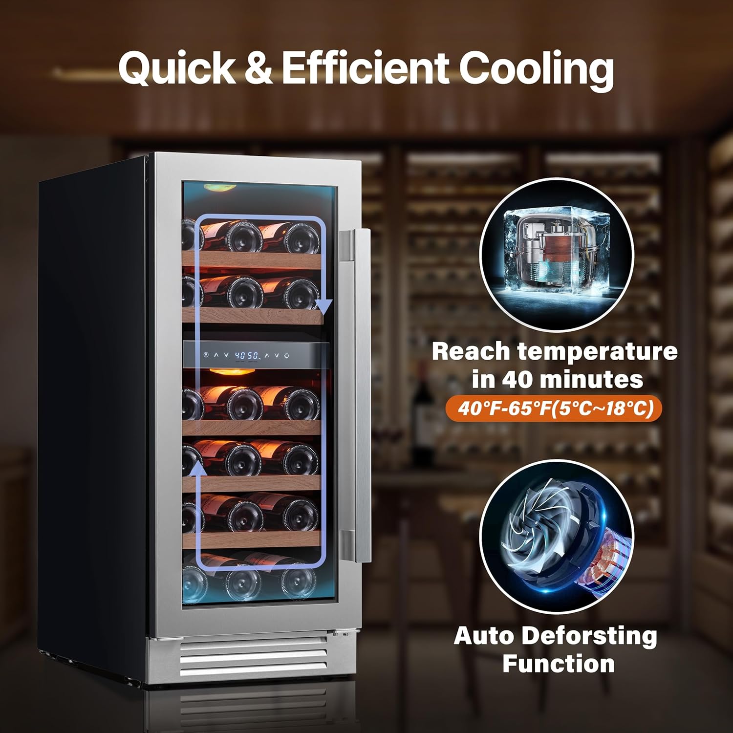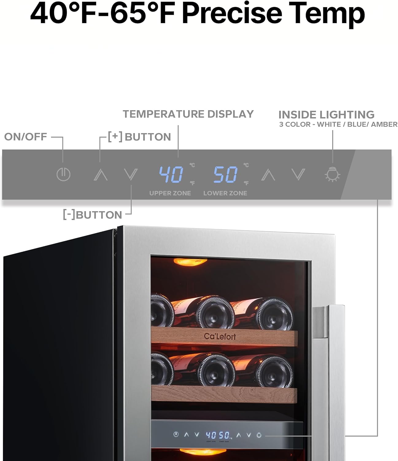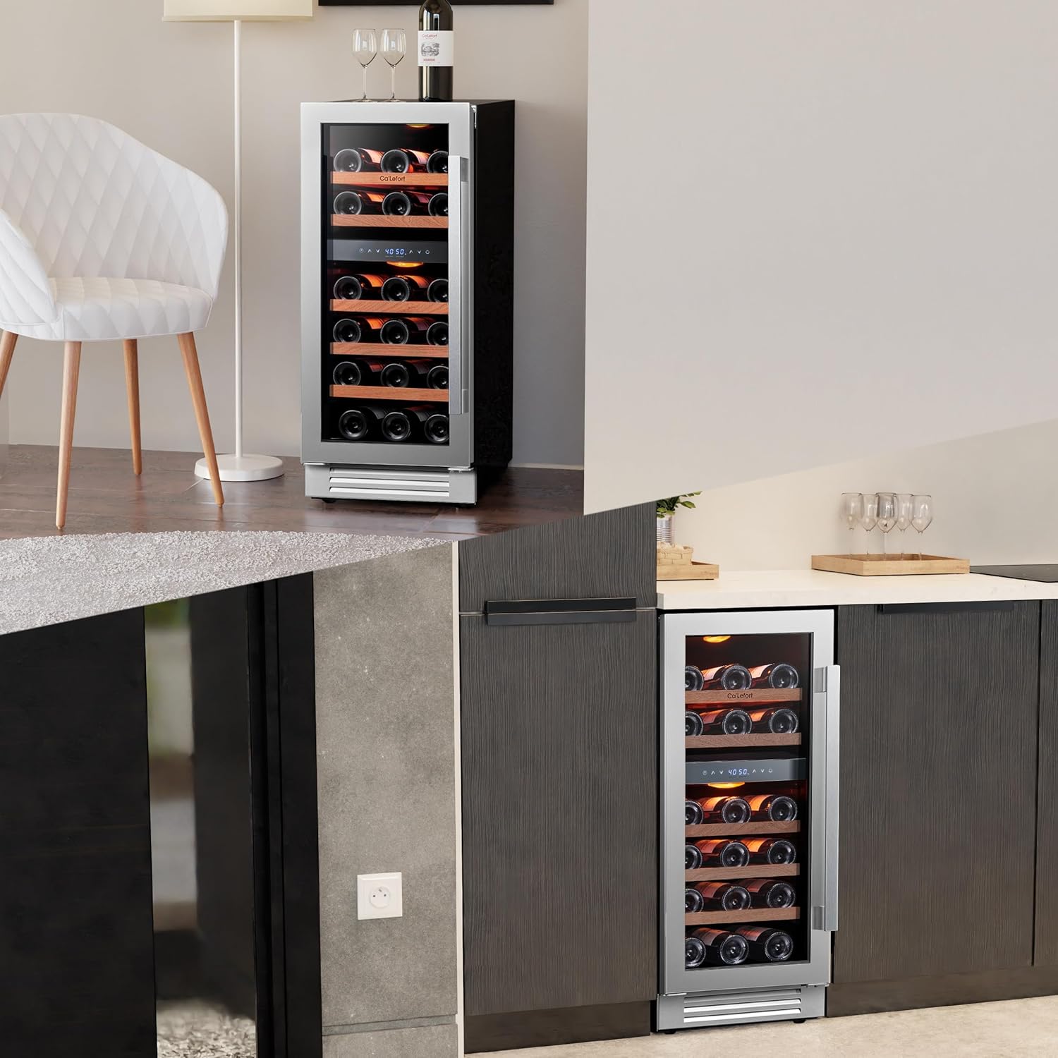 Large Capacity & Dual-ZoneWith 3.00 cu.ft of space and dual-zone temperature control, this wine cooler stores up to 28 Bordeaux bottles. The adjustable, sturdy Shabill wood shelves are corrosion-resistant and make accessing your wine collection easy, ensuring optimal storage conditions for each bottle.
