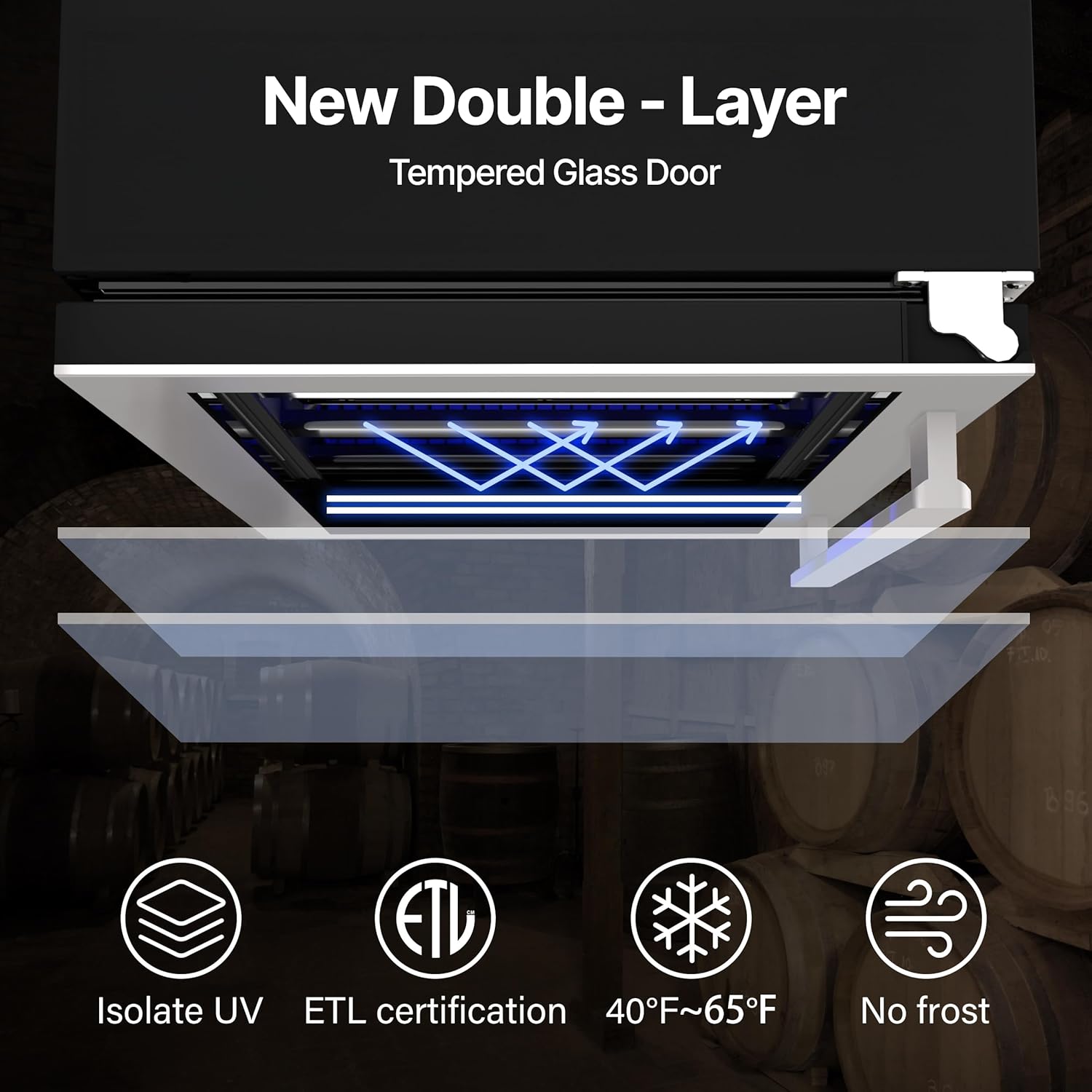 Dual-Layer Glass DoorThe dual-layer tempered glass door blocks harmful UV rays, protecting your wine from light damage, oxidation, and flavor loss. The stylish design also provides an extra layer of protection, enhancing wine preservation.