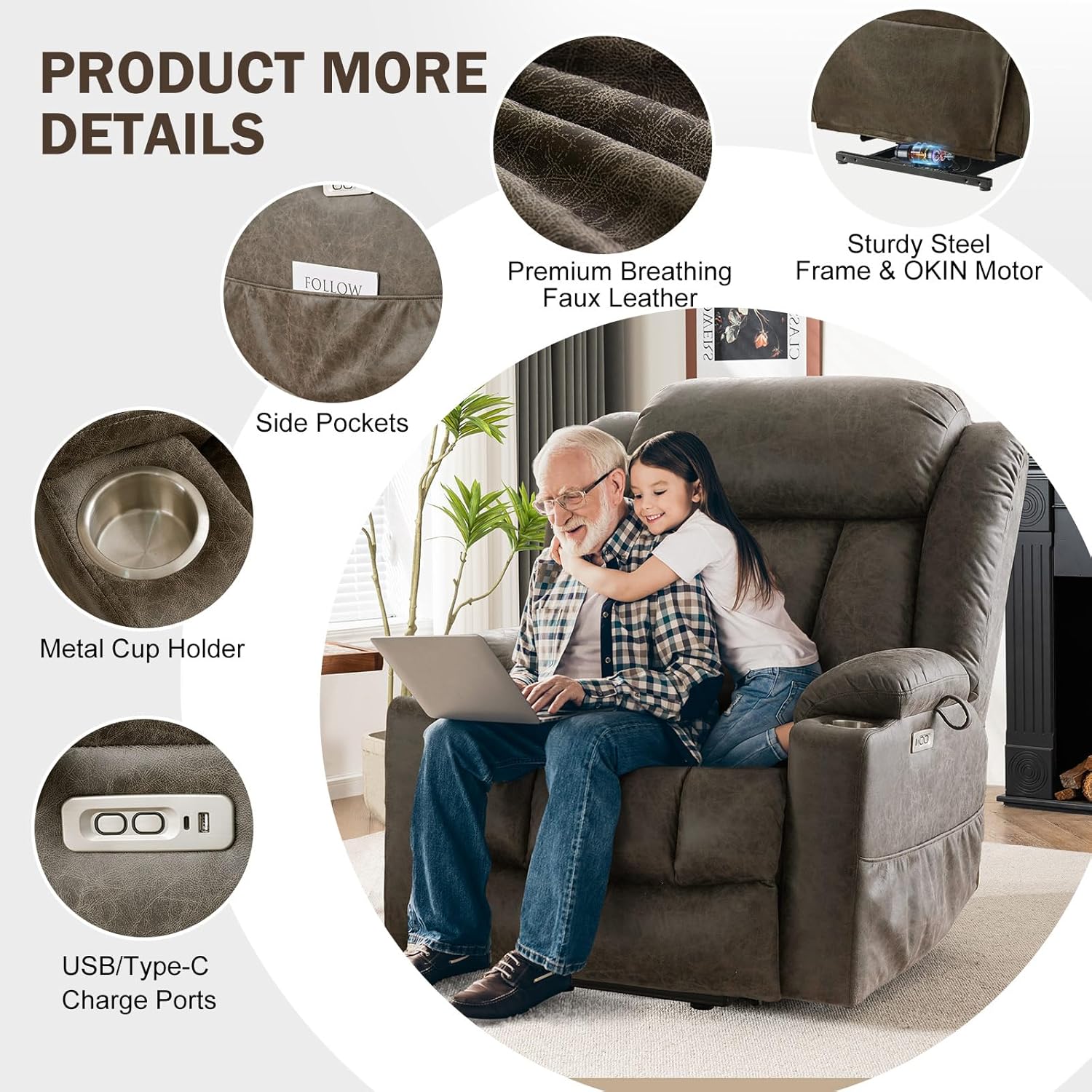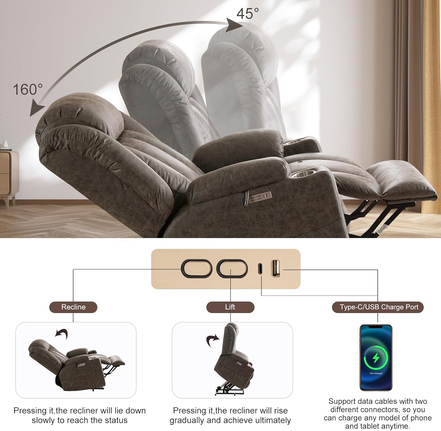 OKIN Motor AND USB & TYPE-C PORTSThis lift chair is powered by OKIN motor for long-lasting durability. Easily customizable from 45 to 160, it is suitable for all ages and helps the elderly to stand up easily. Ideal for people with leg/back problems or limited mobility. With USB and Type-C ports, ready to charge low-power devices such as cell phones and tablets of any model. In addition, 2 side pockets to keep your personal belongings within reach.