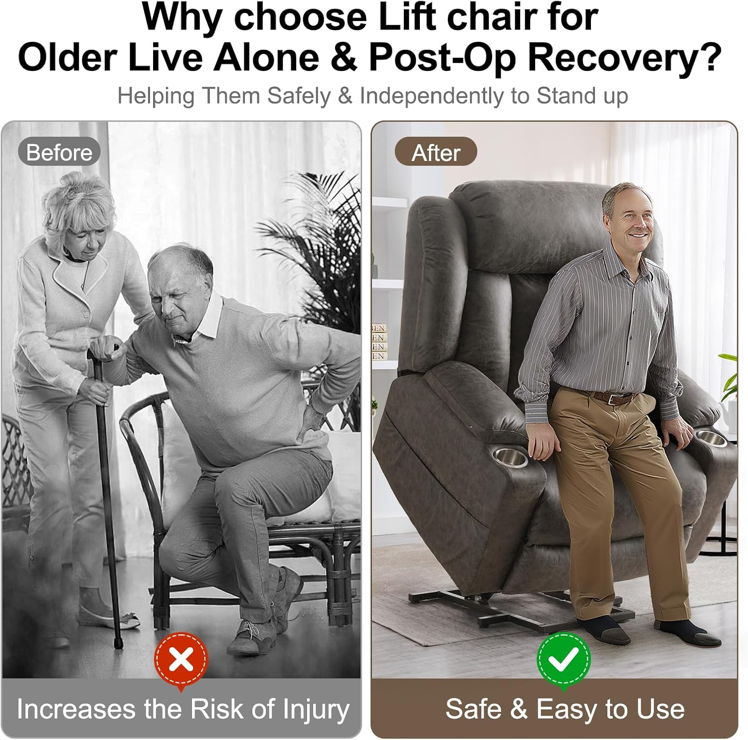 PREMIUM MATERIALSWe use environmentally friendly wood and breathable faux leather, The wood is formaldehyde-free and meets CARBb's P2 requirements. our lift recliners are easier to clean and have better air permeability. Faux leather with breathable micropores has good air permeability, moisture absorption and sweating ability. Even on a hot summer day, our electric recliners offer a great experience.