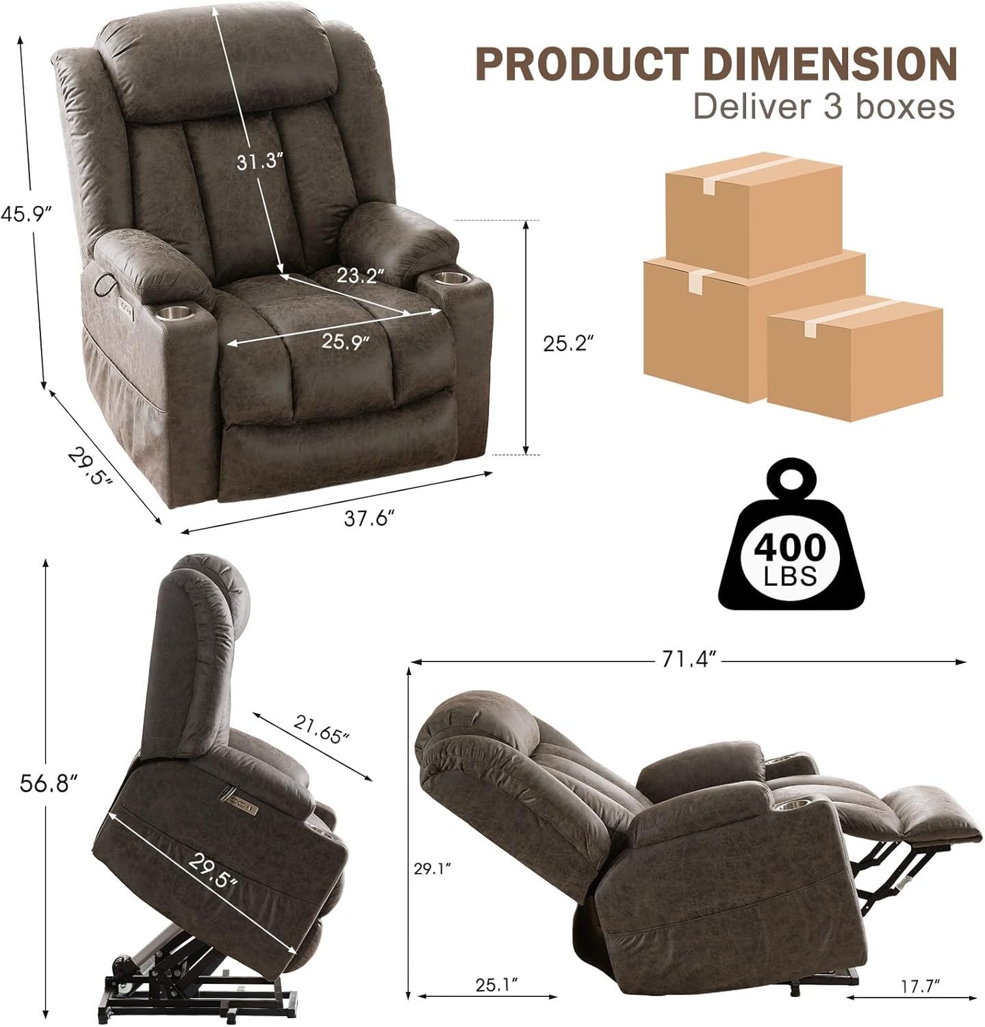 Easy Assembly and Good Customer Service - The recliner comes in 3 boxes and we provide a detailed instruction with numbered steps. Super easy assemble and usually only need 10-15mins to finish the installation, no tools required. We also provide 1 year technical support for the lift motor tand steel frame. If any shipping damage when it arrive or defective during usage, please feel free to contact us, we will provide the best after-sales service!
