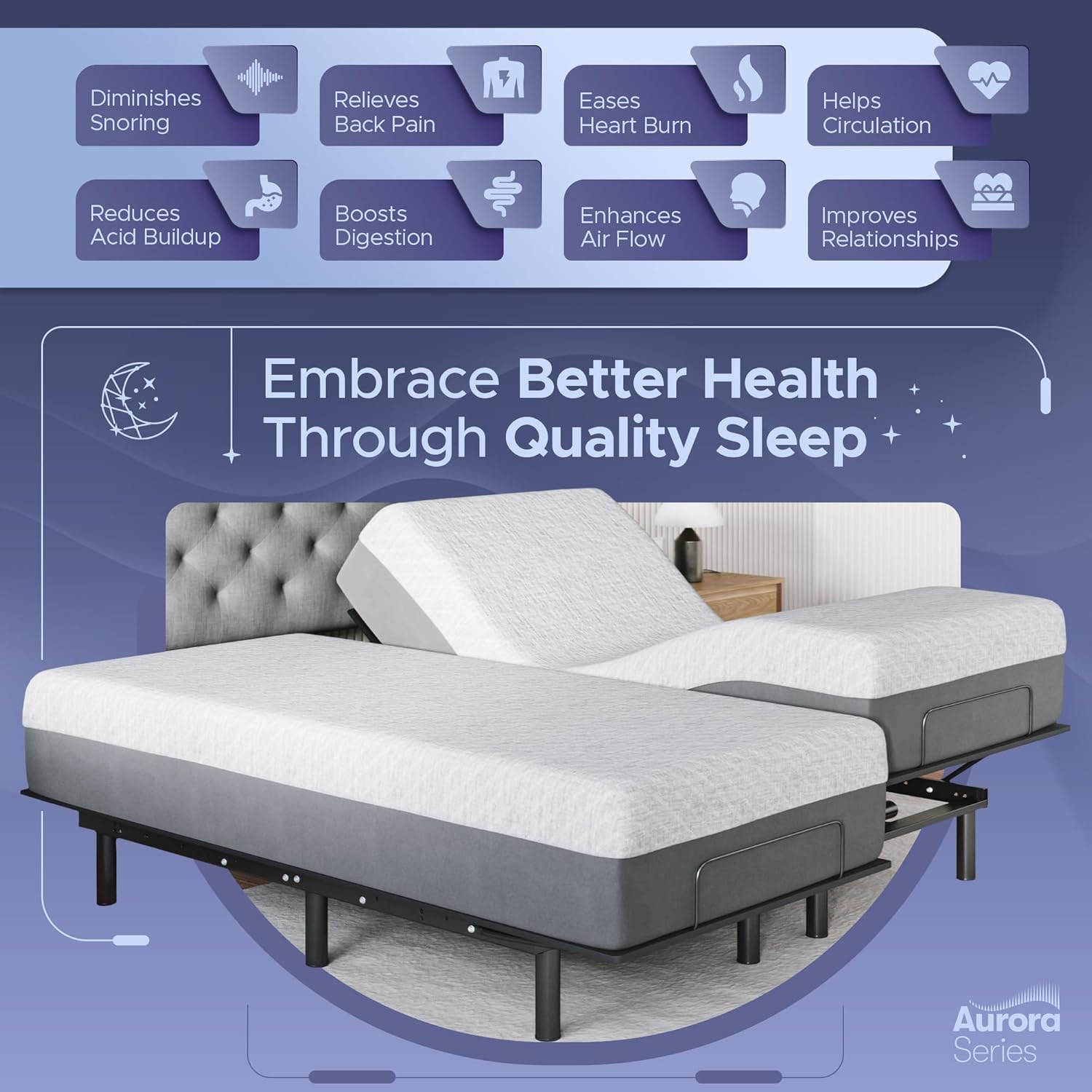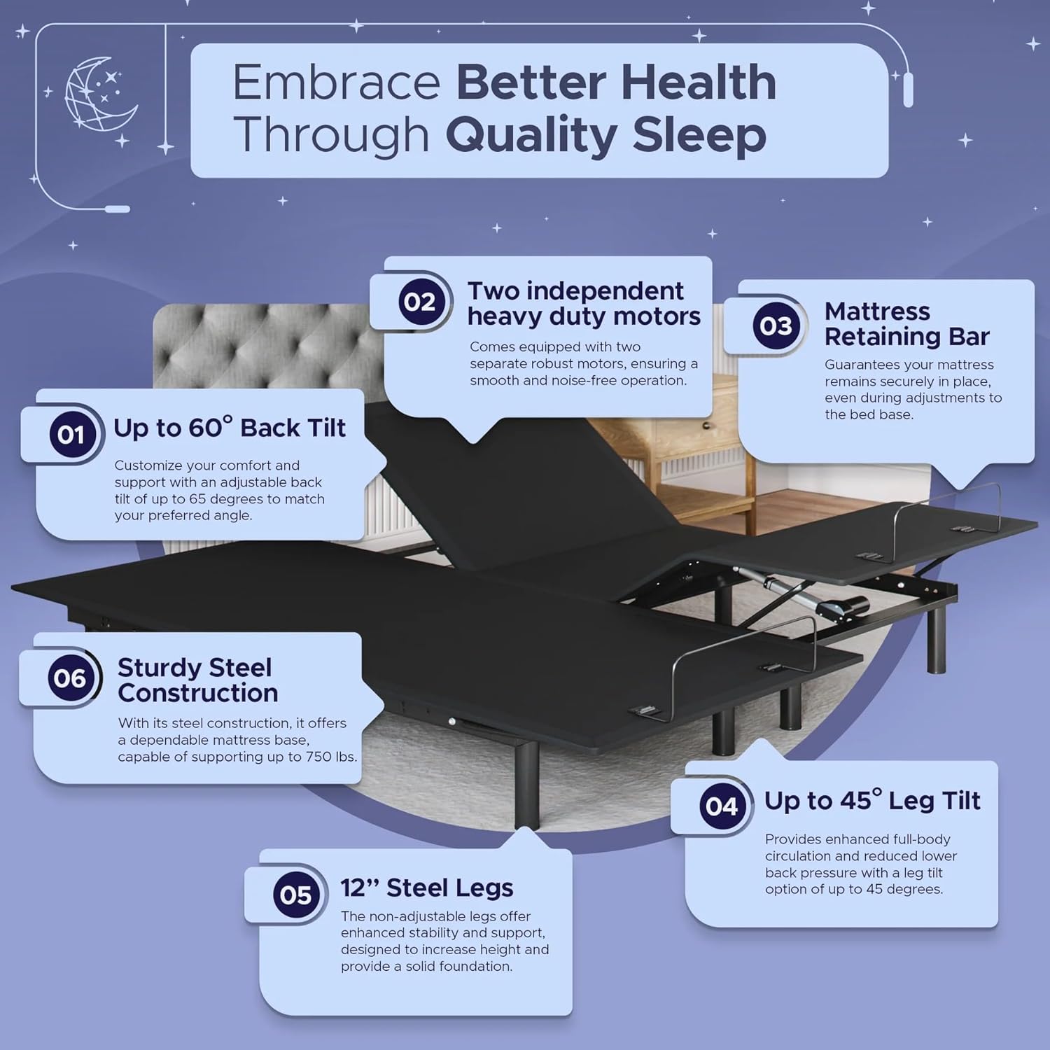 Affordable Comfort with Style: Our adjustable bed combines essential durability and quality features without breaking the bank, ensuring a comfortable sleep without financial strain. Paired with our mattresses, experience unparalleled comfort and support with cooling technology and a balanced structure of multiple foam layers.