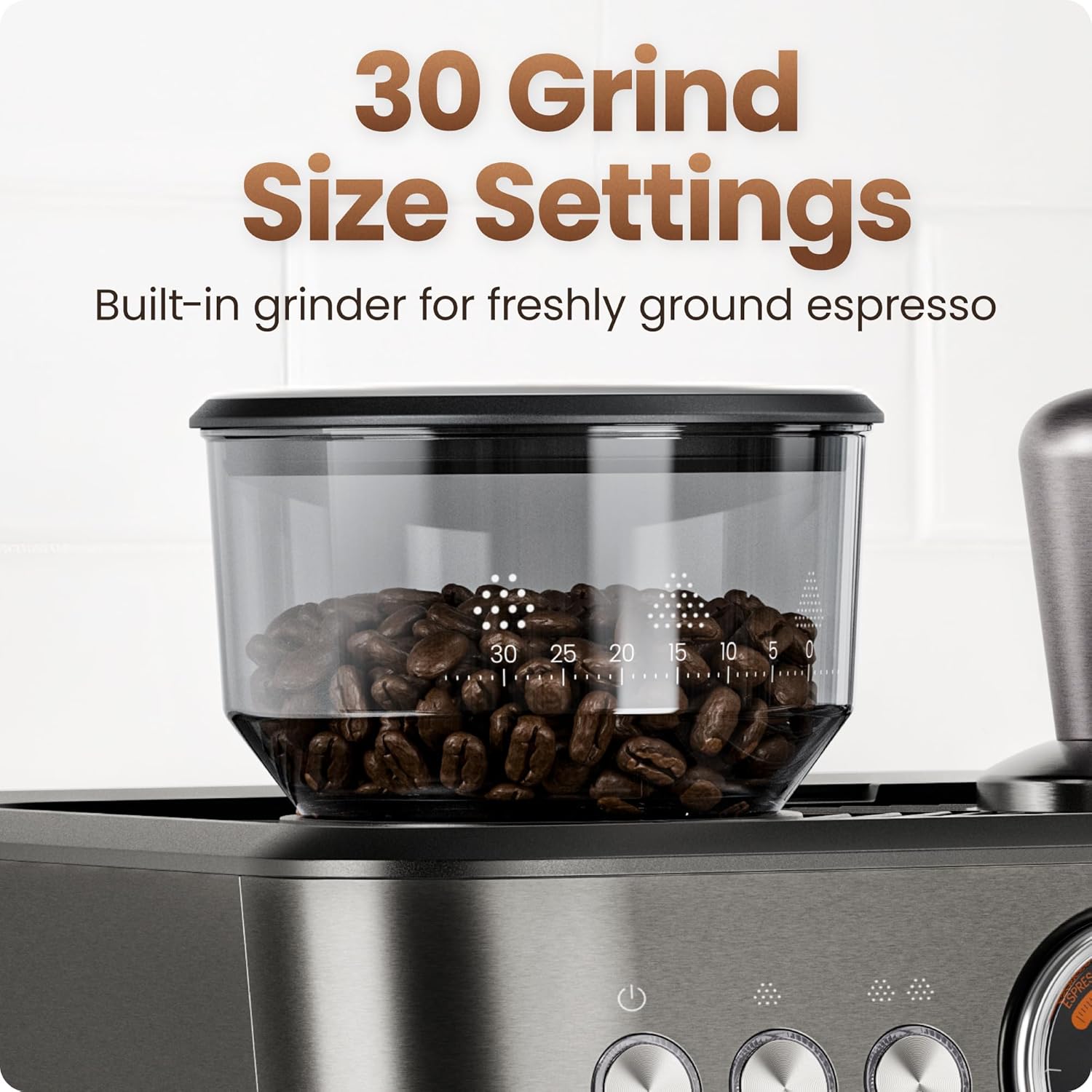 30-SETTING CONICAL BURR GRINDER: Customize your grind with 30 precision settings. Grinder dispenses fresh coffee directly into the portafilter for consistent results.