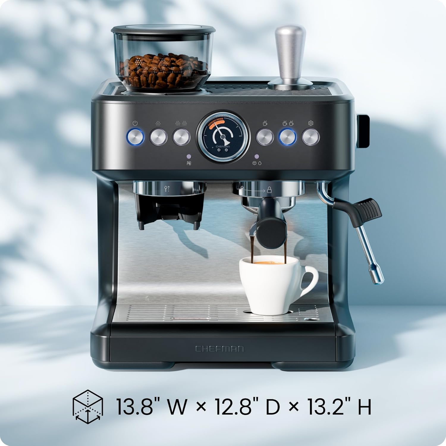 INCLUDES BARISTA ACCESSORIES: The Crema Deluxe is equipped with all the espresso accessories you need, including a milk pitcher, stainless-steel tamper, cleaning tools, and a grinding funnel. Store it all inside of the detachable drip tray.