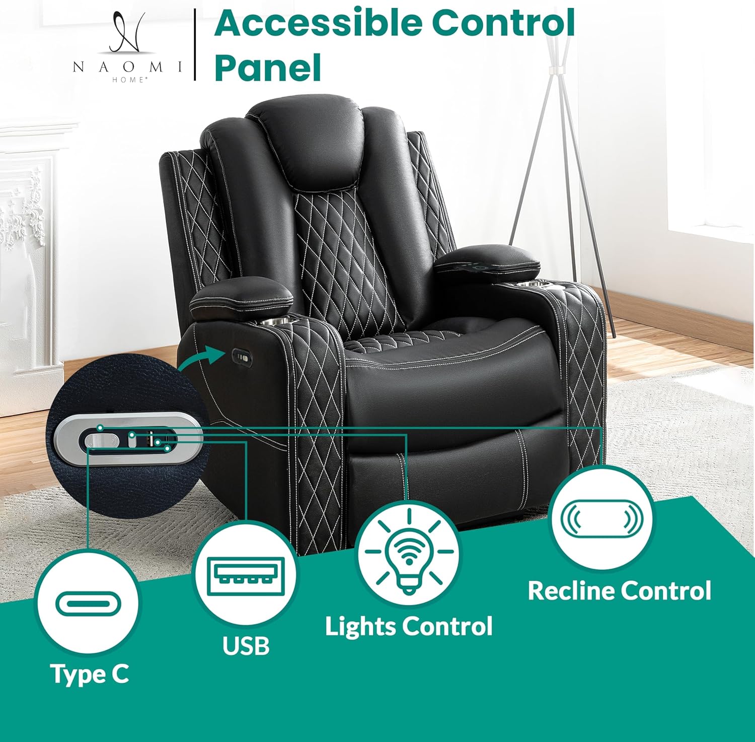 Immersive Entertainment Experience: Equipped with built-in Bluetooth speakers, USB, and wireless charging ports, this modern theater recliner offers convenience and high-tech comfort, perfect for your home theater or living room setup.