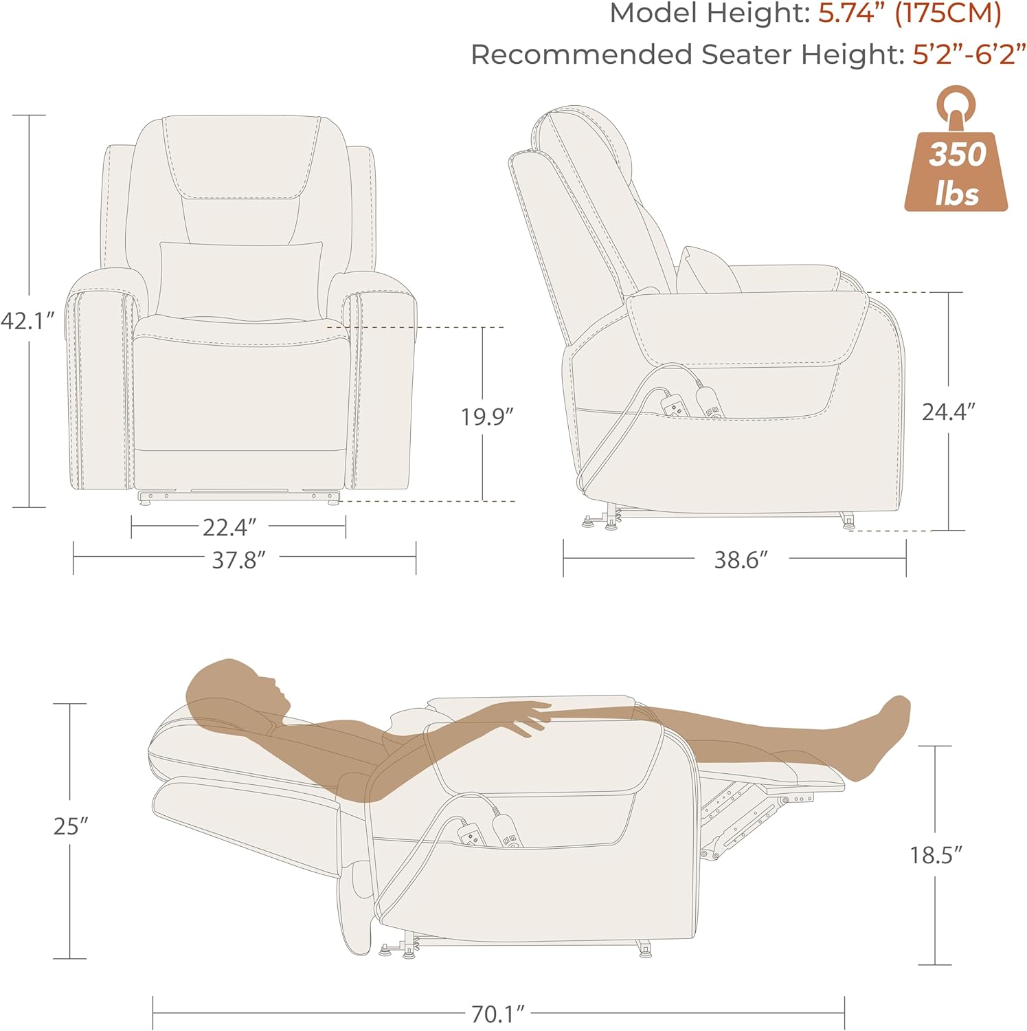 Extra Large Size: Overall Dimension 38.6''D x 37.8''W x 42.1''H. This large lift recliner chair offers more space for big and tall elderly. Seat Dimension: 21.3''D x 22.4''W x 19.9''H. Weight Capacity: 350 lbs. Recommended Seater Height: 5'2"-6'2''.