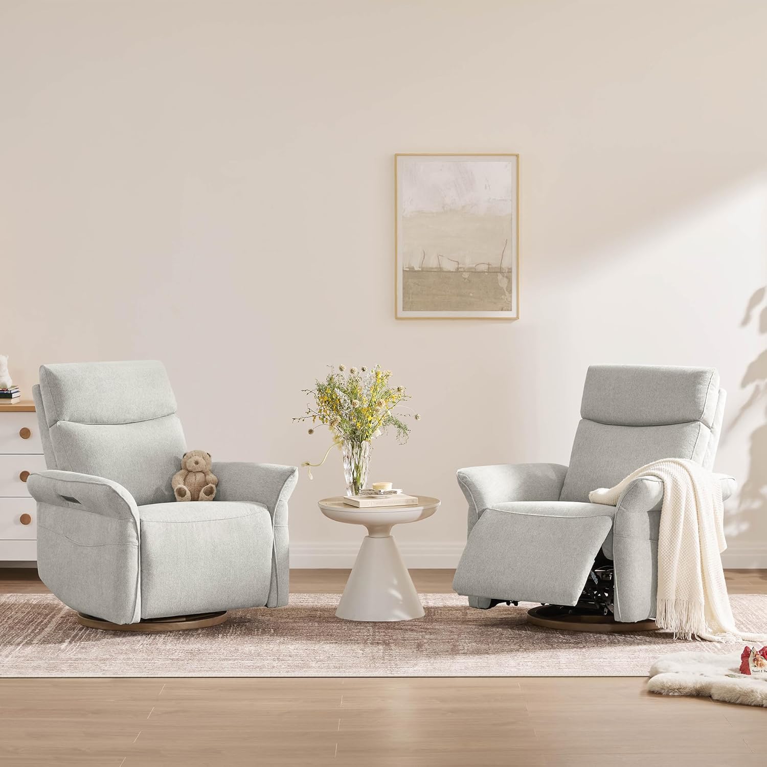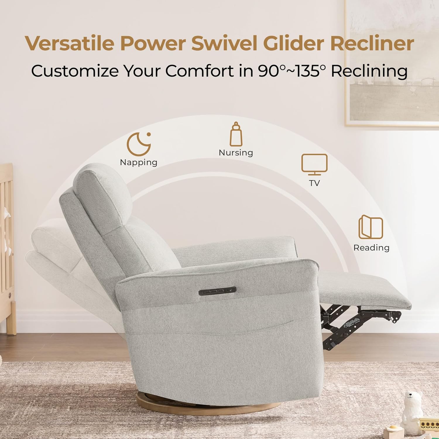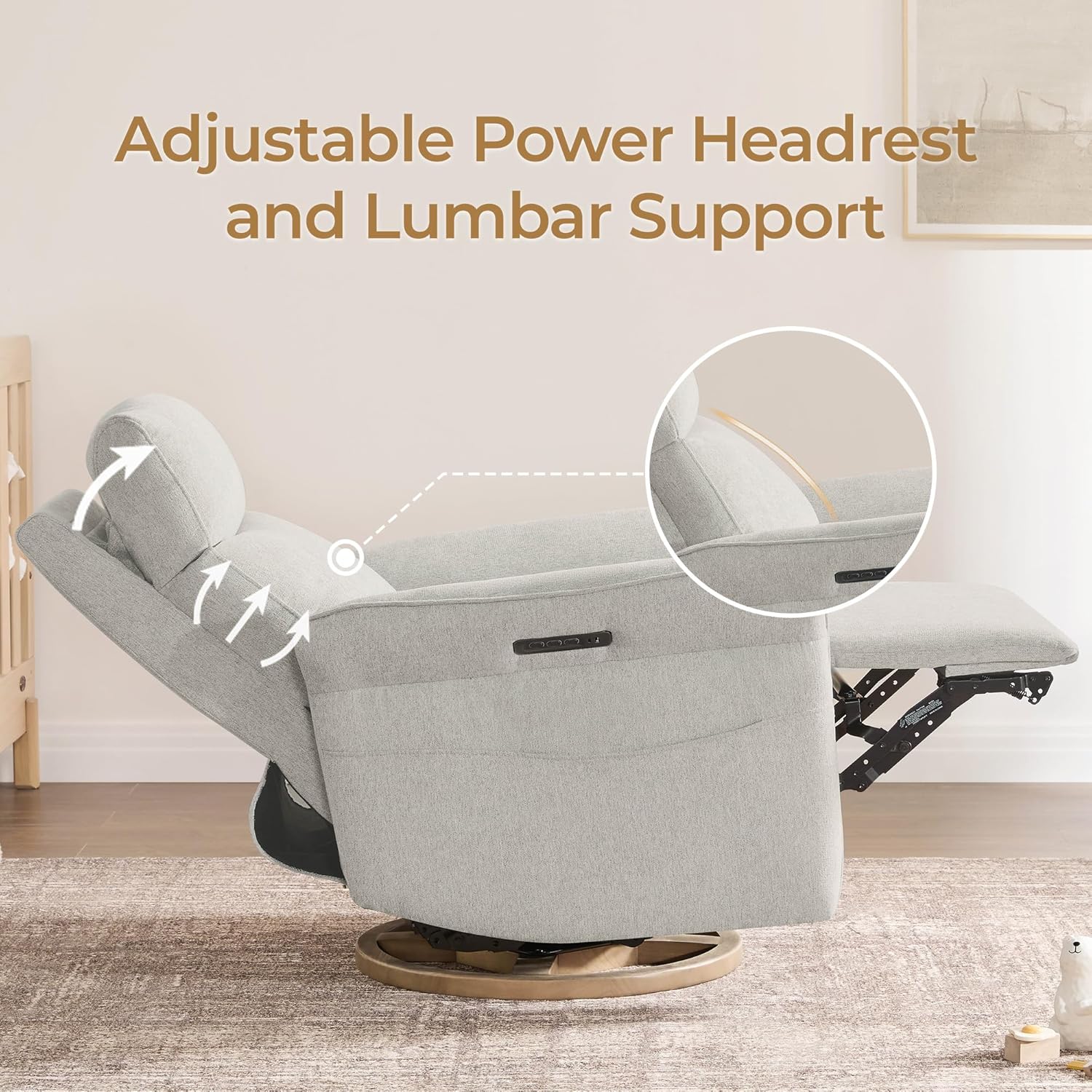 Designed for Comfort & Care: This power glider transforms nursing, lounging, or napping into moments of ease. The outward-turned armrests create a snug, supportive space for breastfeeding or cradling your baby. Raise the padded footrest without reclining to elevate legs for pressure-free TV time. Independent power headrest and lumbar adjustments cradle your head, neck, and waist, alleviating spinal strain and easing lower back tension during extended sitting.