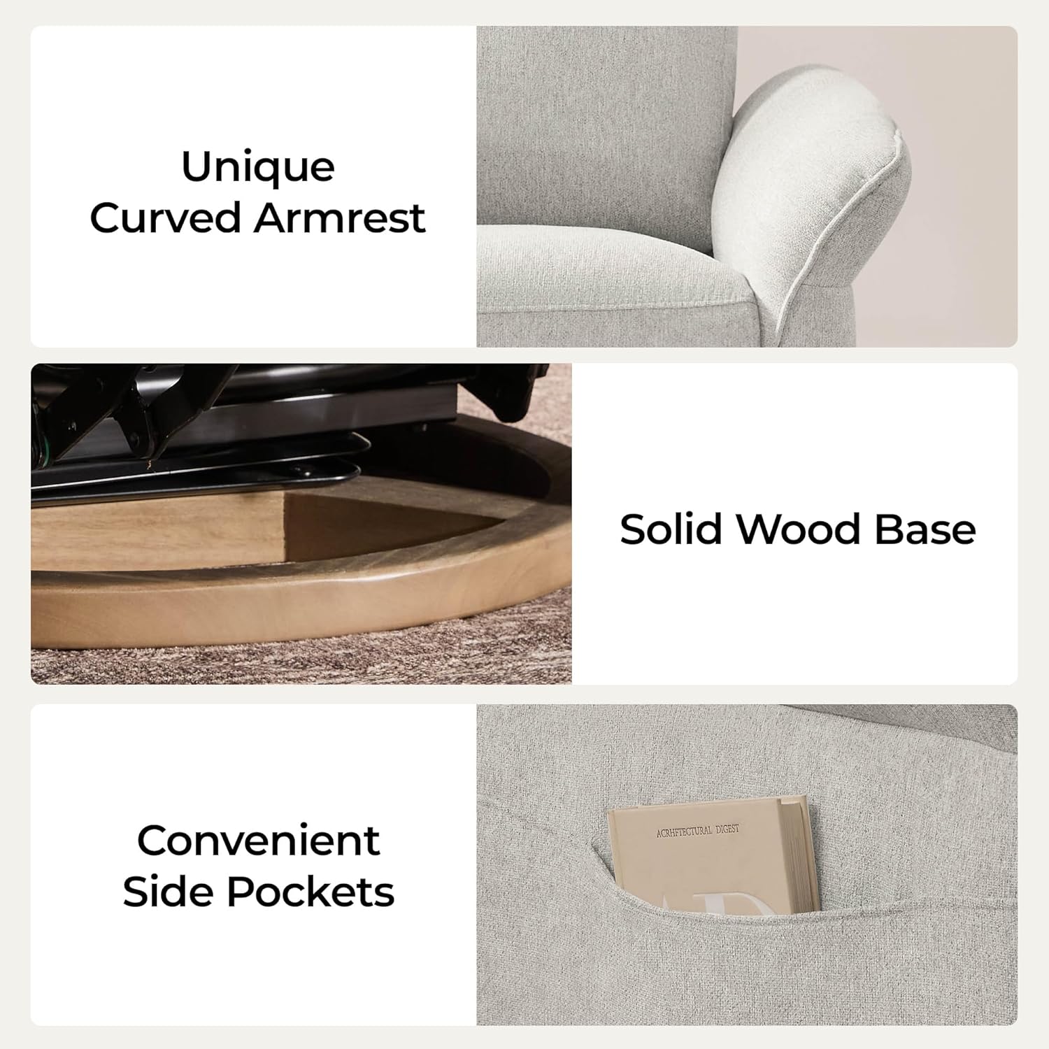 Durable & Sustainable Design: Engineered for longevity, this electric glider rocking chair features a patented Leggett & Platt mechanism rigorously tested through 25,000 cycles. Crafted with eco-conscious materials, it boasts CertiPUR-US certified foam, and FSC-certified wood from responsibly managed forests. This chair is GREENGUARD Gold Certified to provide better indoor air quality and peace of mind for family living spaces. Every element prioritizes durability and safety, ensuring lasting comfort while safeguarding your familys health and indoor air quality.