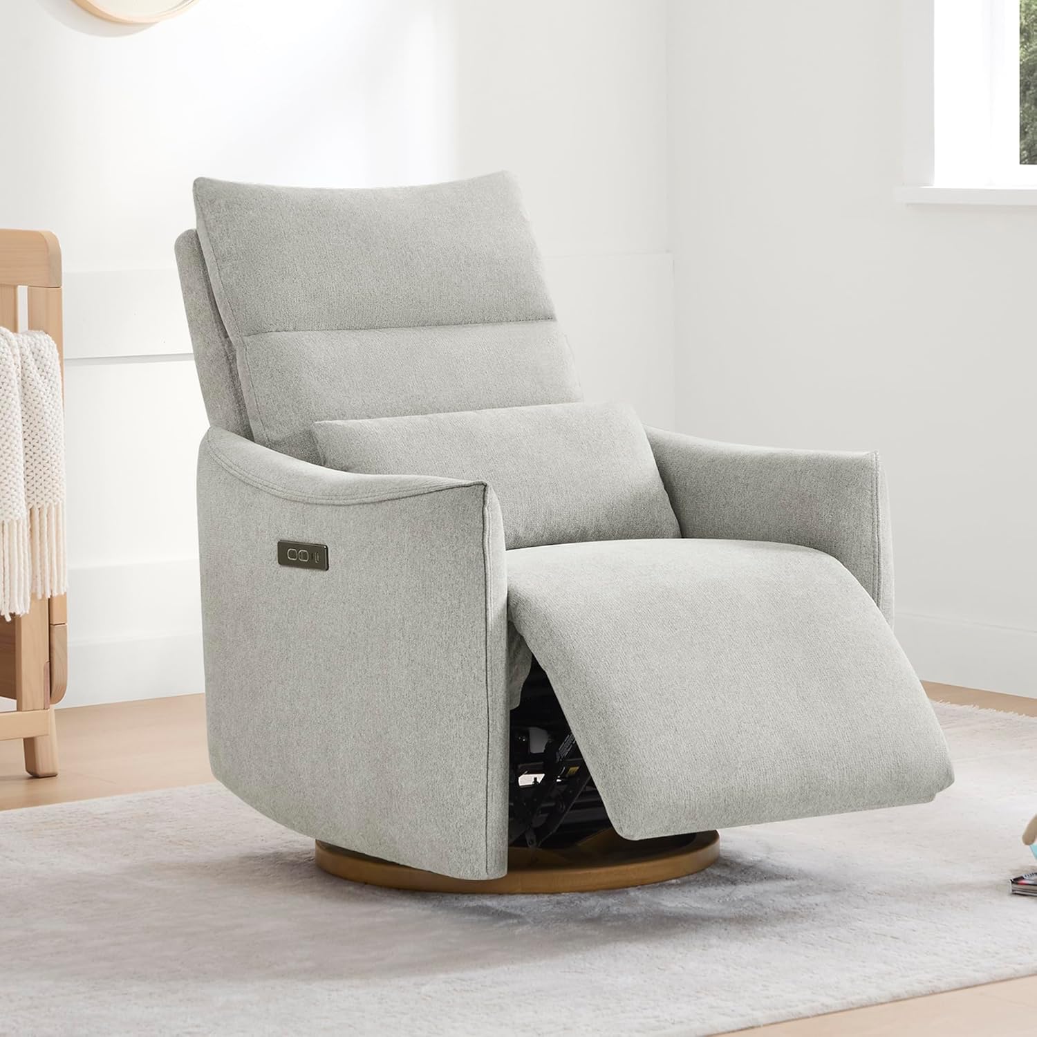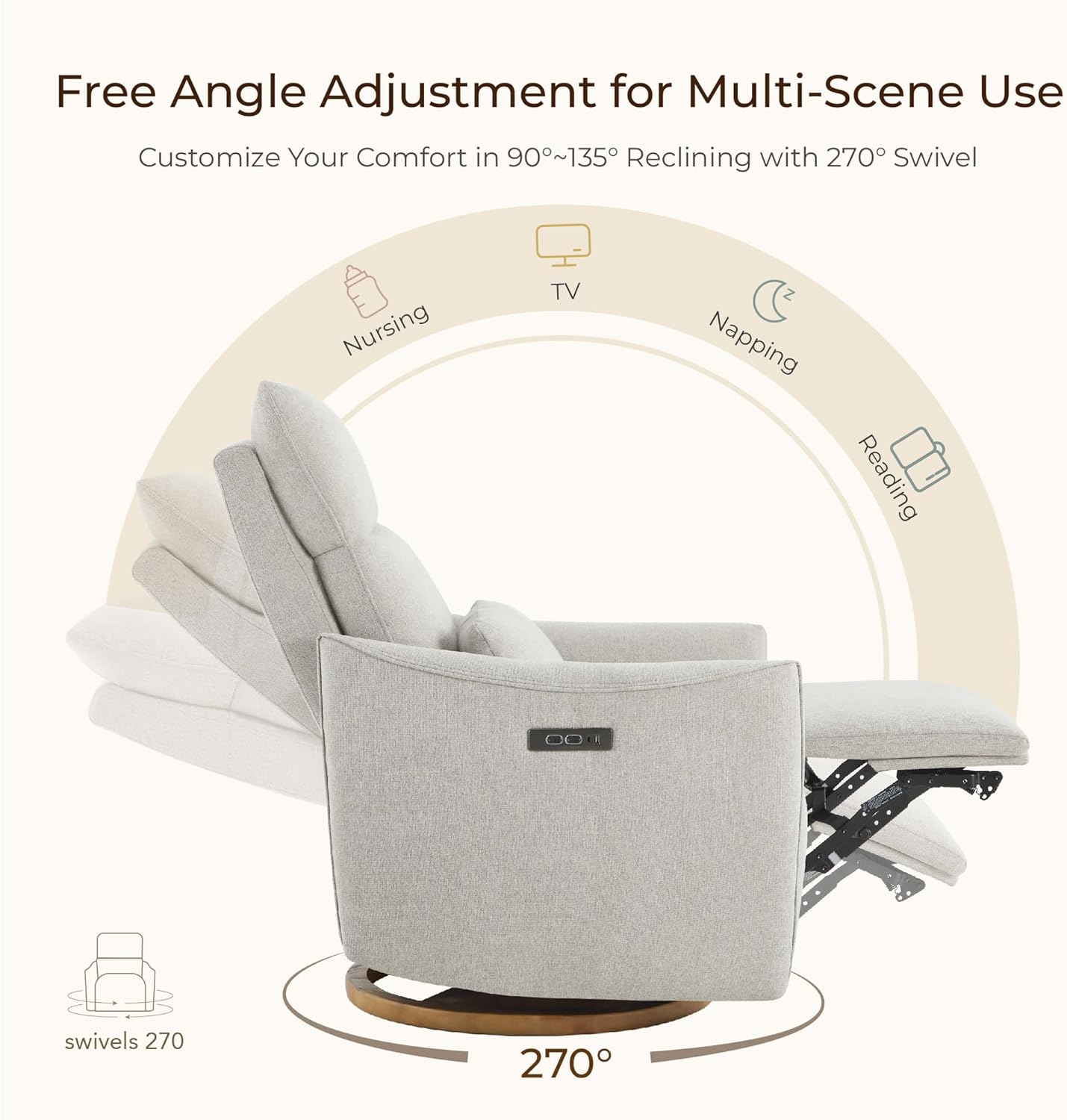 • Swivel Rocker Recliner Chair, Power Nursery Glider Recliner, Nursery Rocking Chair with Adjustable Power Headrest, FSC Certified, Solid Wood Base, Crockery (Gray)
