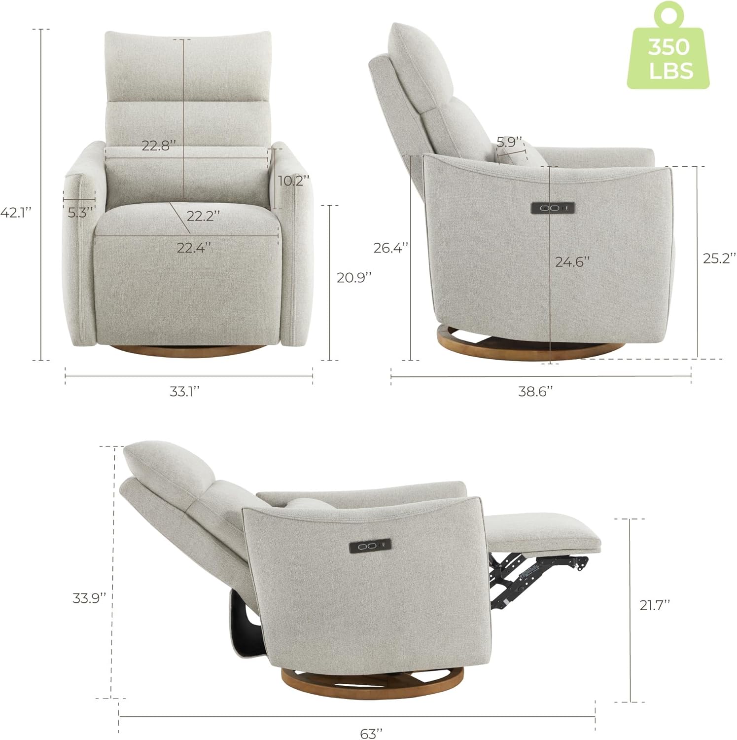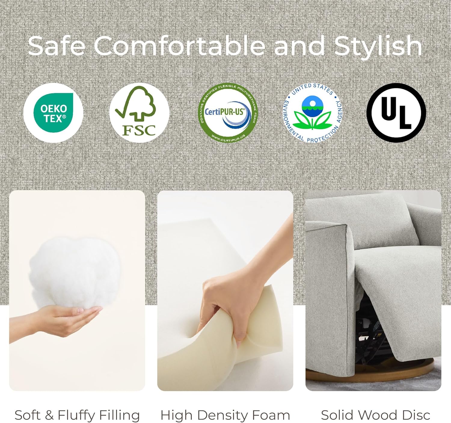 Comfortable & Convenient - This swivel rocker recliner chair offers 270 swivel and gliding motion for smooth, effortless movement while tending to your baby. The no-sag spring platform ensures long-lasting support and unwavering comfort. The concave-arc armrests provide extra comfort during breastfeeding, while the removable lumbar pillow supports your waist when lying down and can be positioned anywhere for added comfort. For added convenience, built-in USB and Type-C charging ports are located on the reclining activator button, allowing you to charge your mobile phone easily. These features make it perfect for multitasking usage and enhance your caregiving experience.