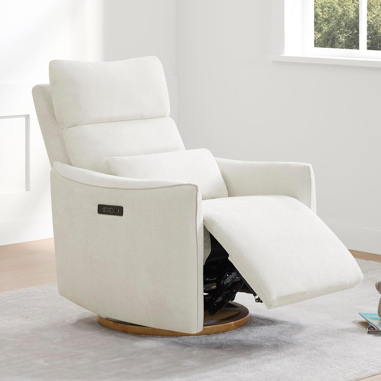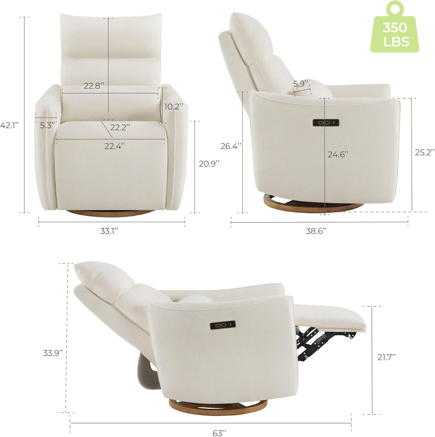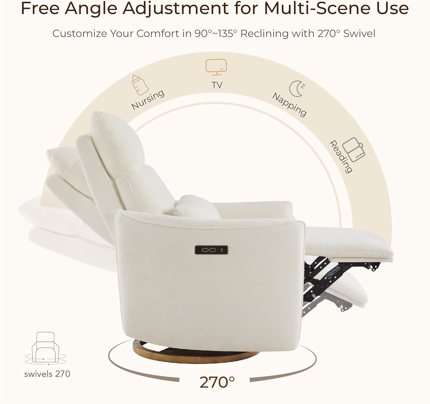 Comfortable & Convenient - This swivel rocker recliner chair offers 270 swivel and gliding motion for smooth, effortless movement while tending to your baby. The no-sag spring platform ensures long-lasting support and unwavering comfort. The concave-arc armrests provide extra comfort during breastfeeding, while the removable lumbar pillow supports your waist when lying down and can be positioned anywhere for added comfort. For added convenience, built-in USB and Type-C charging ports are located on the reclining activator button, allowing you to charge your mobile phone easily. These features make it perfect for multitasking usage and enhance your caregiving experience.
