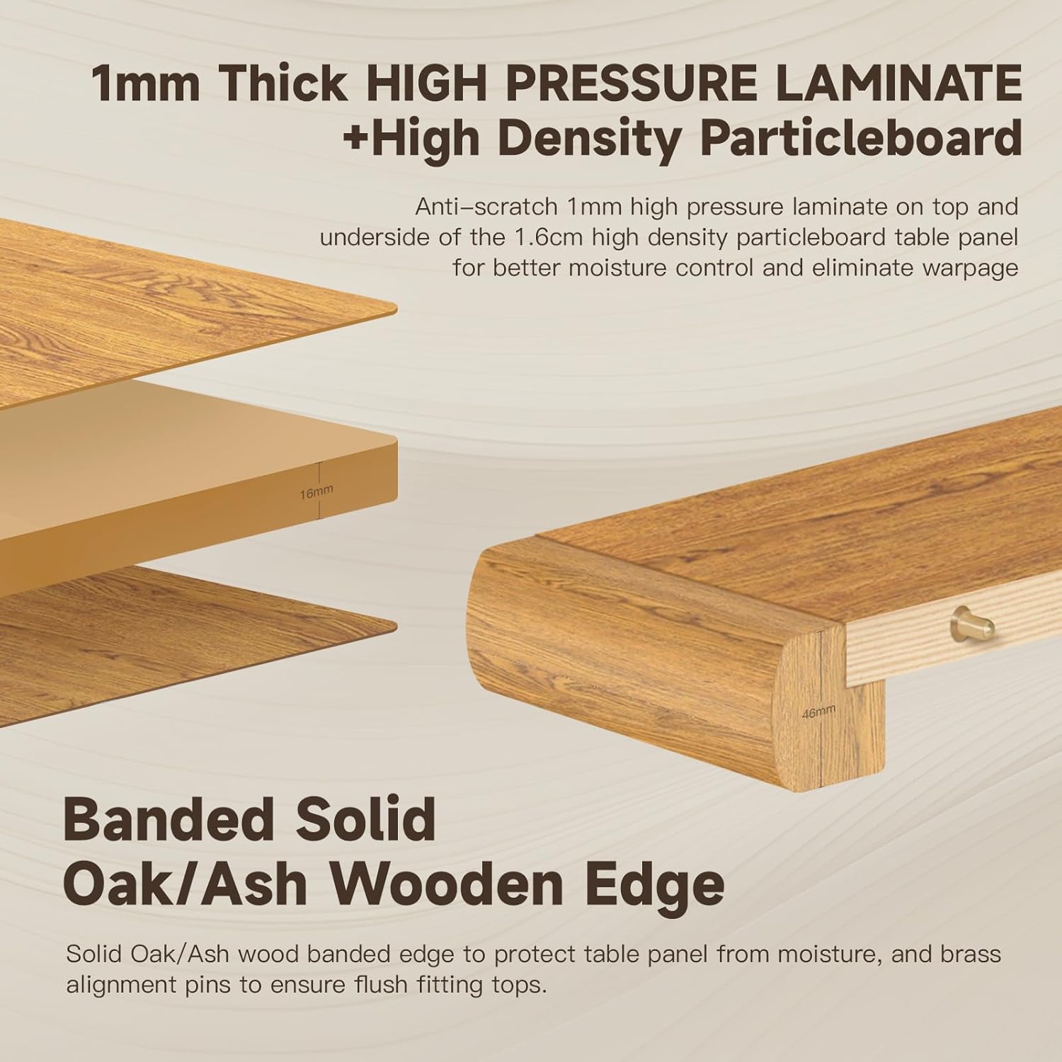 High Pressure LaminateThe table is equipped with 1mm scratch-resistant High Pressure Laminate on the top surface, effectively protecting the wooden panels from damage caused by external forces, utensils, moisture. The same material is used on the bottom surface to provide a balanced construction and eliminating any warpage. The extension mechanism and mounting plate at the base are installed on the laminate board to enhance better stability and durability of the table.